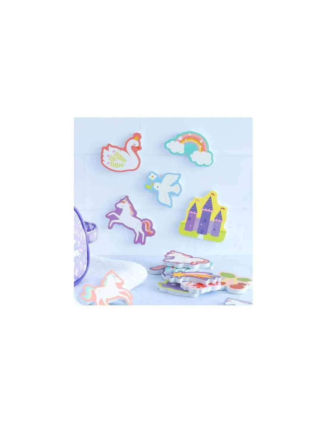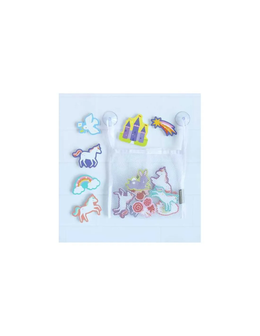 Vivez un plaisir de bain sans fin avec ce joli jouet de bain en mousse avec des licornes. Les 14 pièces adhèrent au mur de la douche ou au carrelage lorsqu’elles sont mouillées et peuvent être soigneusement rangées dans le filet fourni après utilisation.