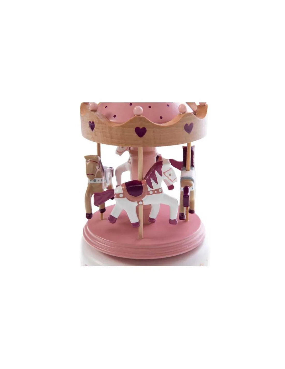 Ce cadeau trouvera sa place dans toutes les chambres d’enfants. Un manège musical où le mécanisme de la boite à musique se remonte en maintenant la partie inférieure du carrousel tout en tournant le chapiteau dans le sens des aiguilles d’une montre.
