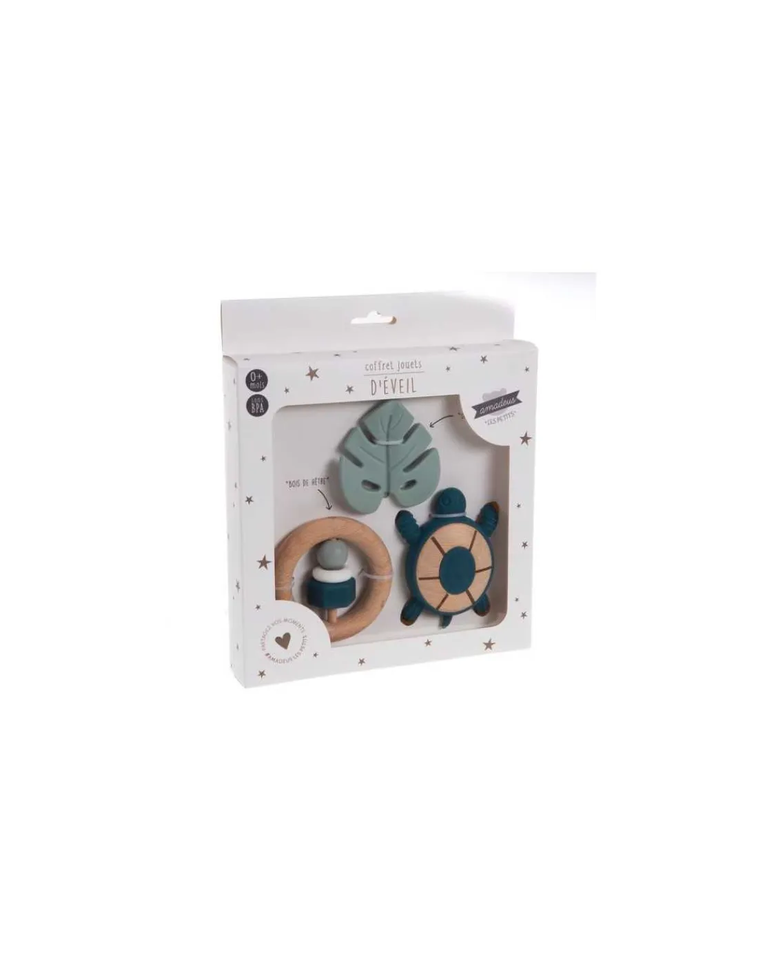 Découvrez le Coffret 3 jouets d’éveil tortue de Amadeus Les Petits, un coffret cadeau de naissance pour les tous-petits comprenant 3 jouets d’éveil en bois et silicone.