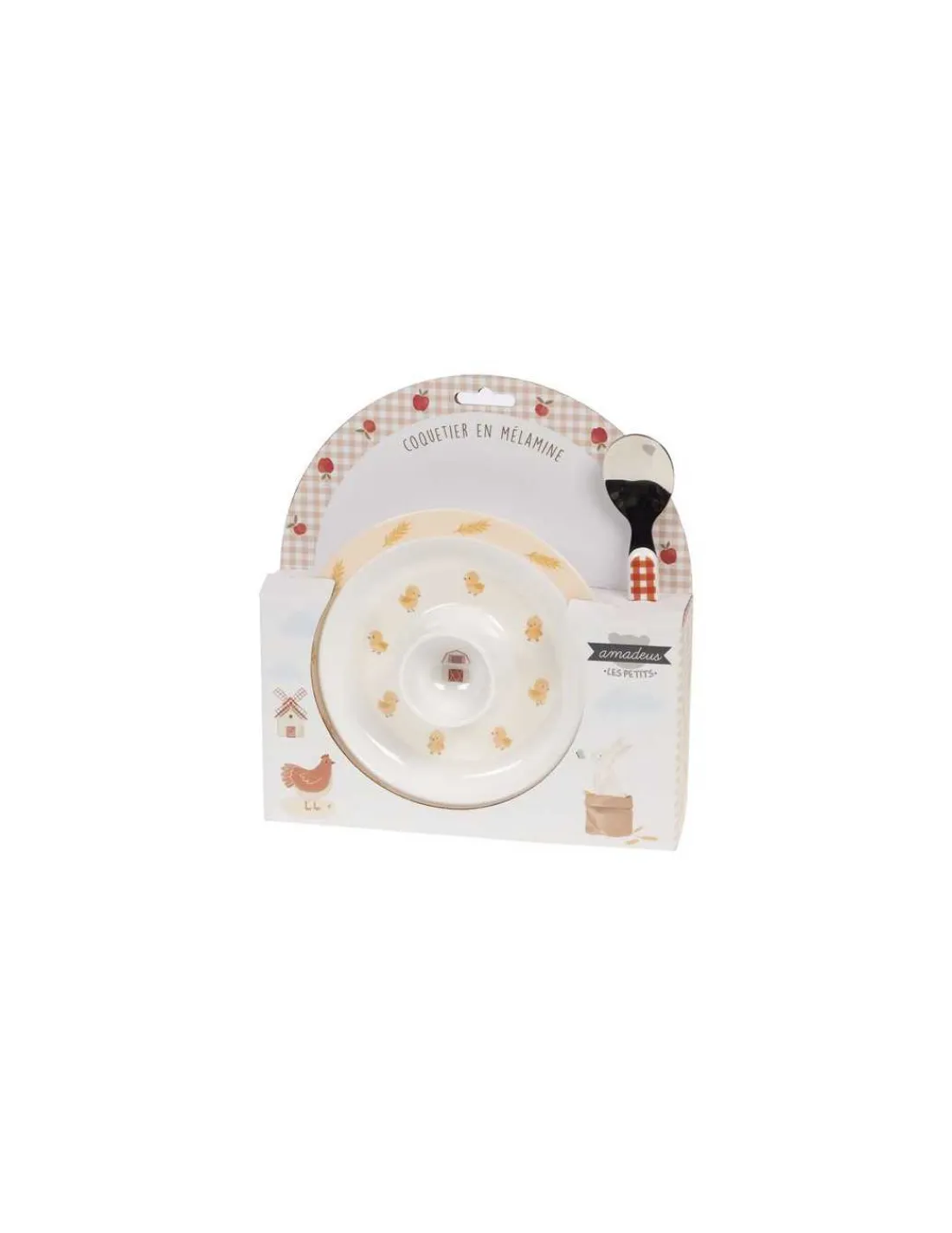 Découvrez le coffret coquetier Justin de Amadeus Les Petits, un coffret vaisselle qui se compose de 2 pièces avec une assiette avec un coquetier central et une cuillère pour les enfants.