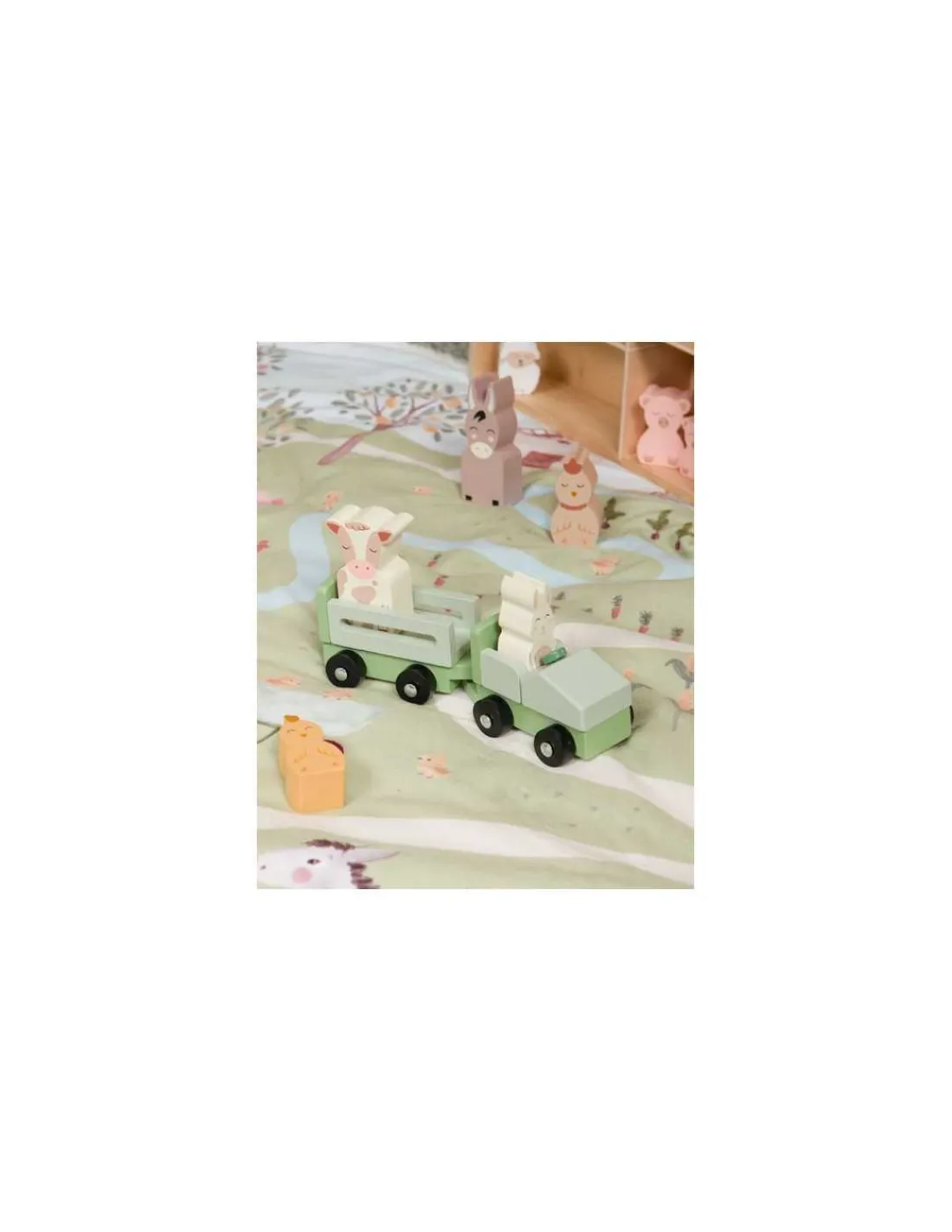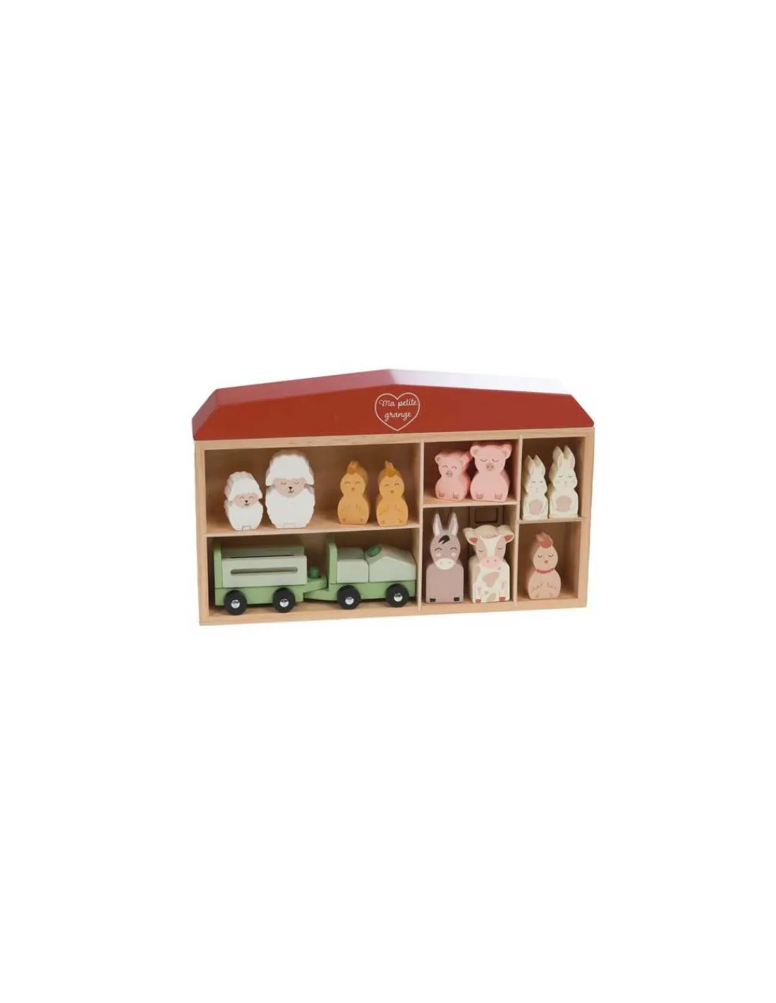 Découvrez Ma petite grange et les animaux de Amadeus Les Petits, un coffret en bois sur le thème de la ferme comprenant des animaux et un tracteur avec remorque pour les enfants dès 2 ans.