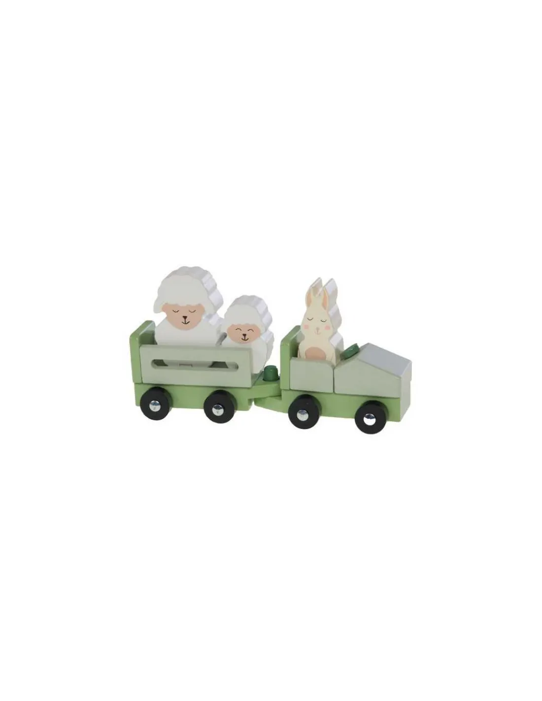 Le coffret comprend 2 moutons, 2 poules, 2 cochons, 2 lapin, un âne, une vache, une poule et un tracteur avec sa remorque.