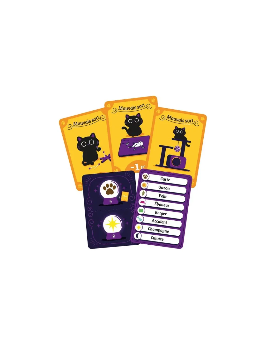 Exemple à 3 joueurs: Irma essaye de faire deviner le mot secret Poisson en 4 indices. Après avoir dit “Astrologie” et “Lune”, elle dit ” Queue” en 3e indice. Félix propose Poisson, la manche s’arrête immédiatement et lui seul gagne 3 points! Mauvais sorts et Malédiction inclus, pour le plaisir de se faire des ennemis.