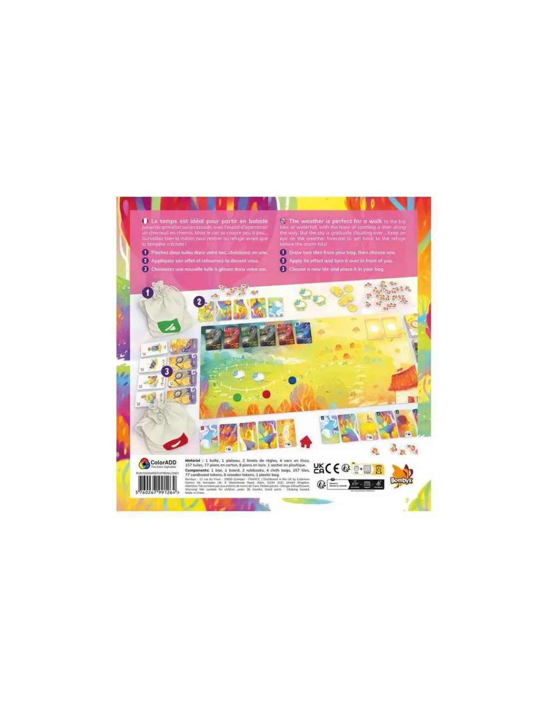 Le temps est idéal pour aller jusqu’au grand lac avec l’espoir d’apercevoir un chevreuil. Votre balade se constitue au fil des tuiles piochées dans votre sac et posées devant vous. Choisissez bien celles que vous ajoutez à votre sac pour avoir les meilleures chances de marquer des points. Mais surveillez bien la météo pour rentrer au refuge avant que la tempête n’éclate !