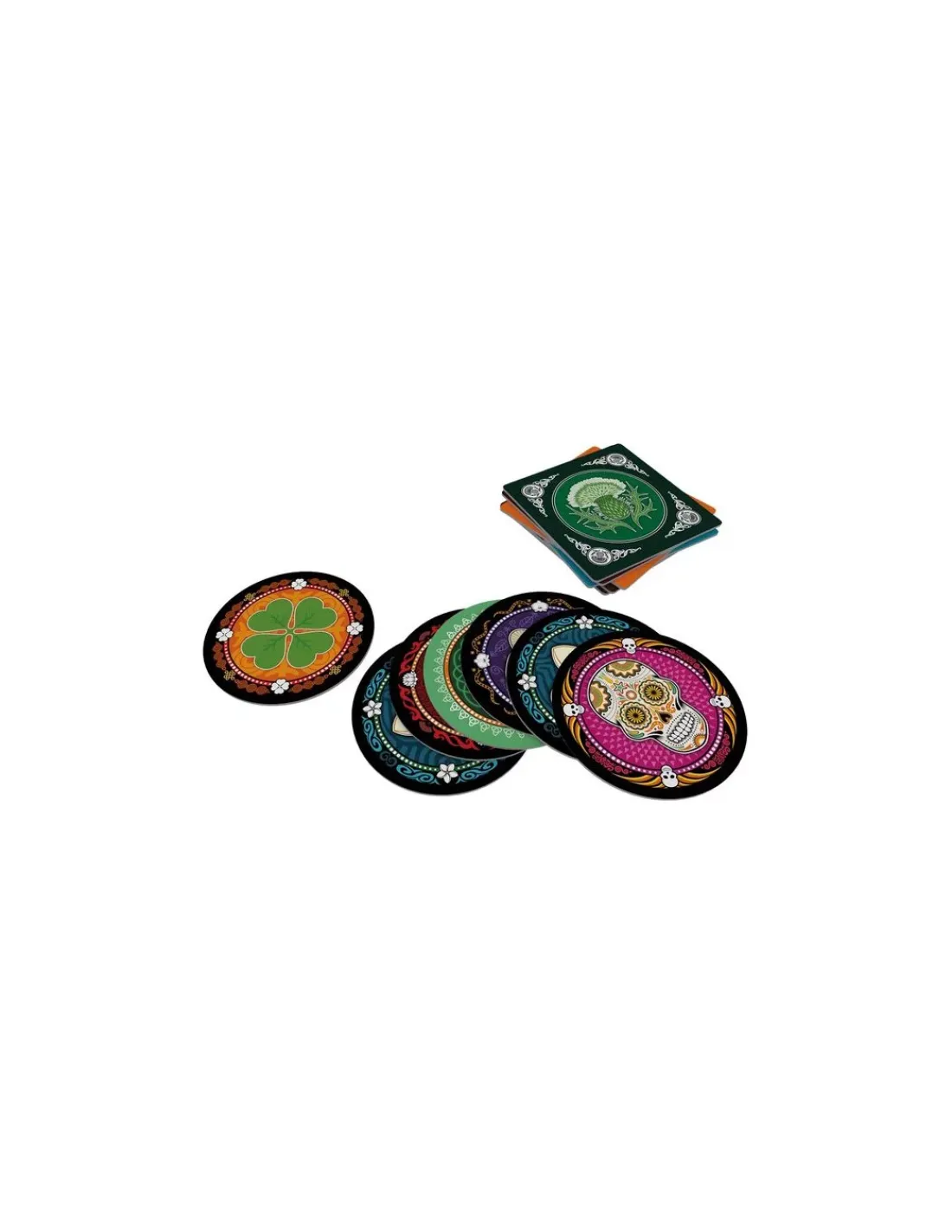 Ce jeu contient 6 sets (un par joueur) comprenant: 4 disques (3 faces fleur, 1 face crâne, dos identiques), 1 tapis de jeu, 1 disque Dernière chance et 1 règle du jeu.