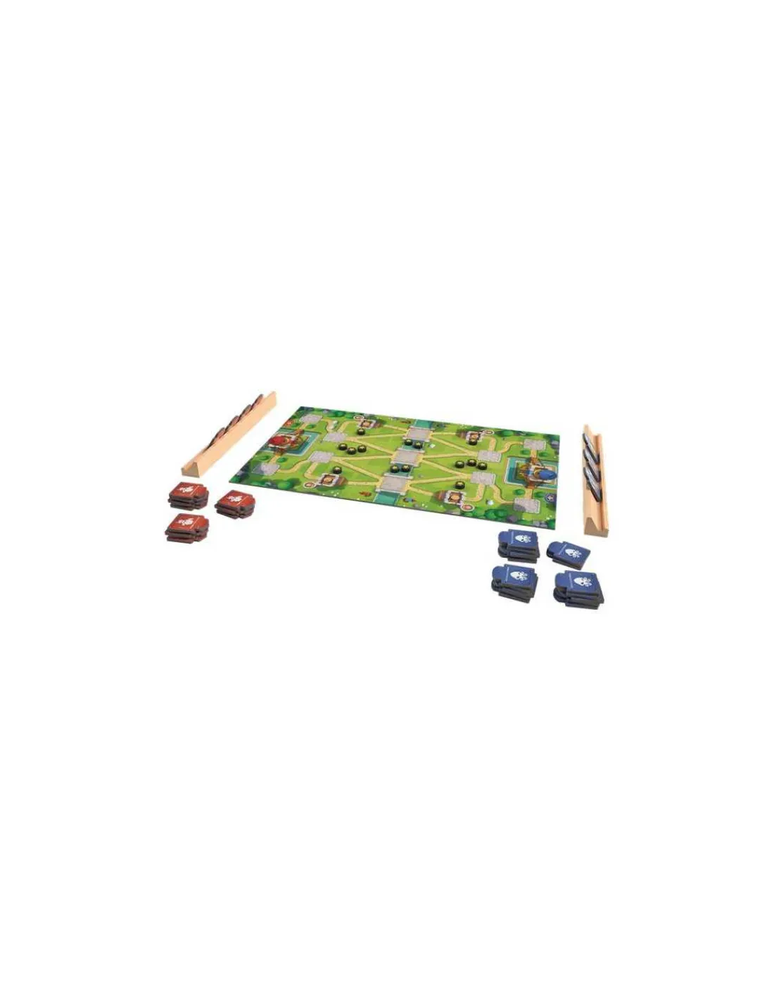 À votre tour de jeu, piochez deux tuiles « Troupe » de votre couleur ou posez une tuile en respectant les règles : elle doit se placer sur une case vide ou par-dessus une tuile de nombre inférieur, et vous devez pouvoir tracer une ligne continue entre votre base et la tuile que vous posez. Ensuite, appliquez son pouvoir. Petit à petit, vous gagnerez des médailles ou prendrez la base adverse, remportant la partie. Affrontez-vous sur les 8 champs de bataille différents pour varier les stratégies!