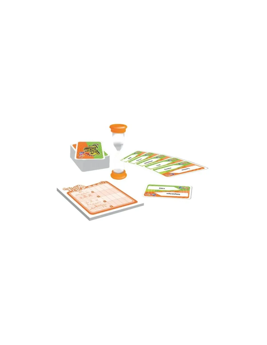 Ce jeu contient 220 cartes, 1 carnet de résultats, 1 sablier de 30 secondes, 1 sac de transport et la règle du jeu.