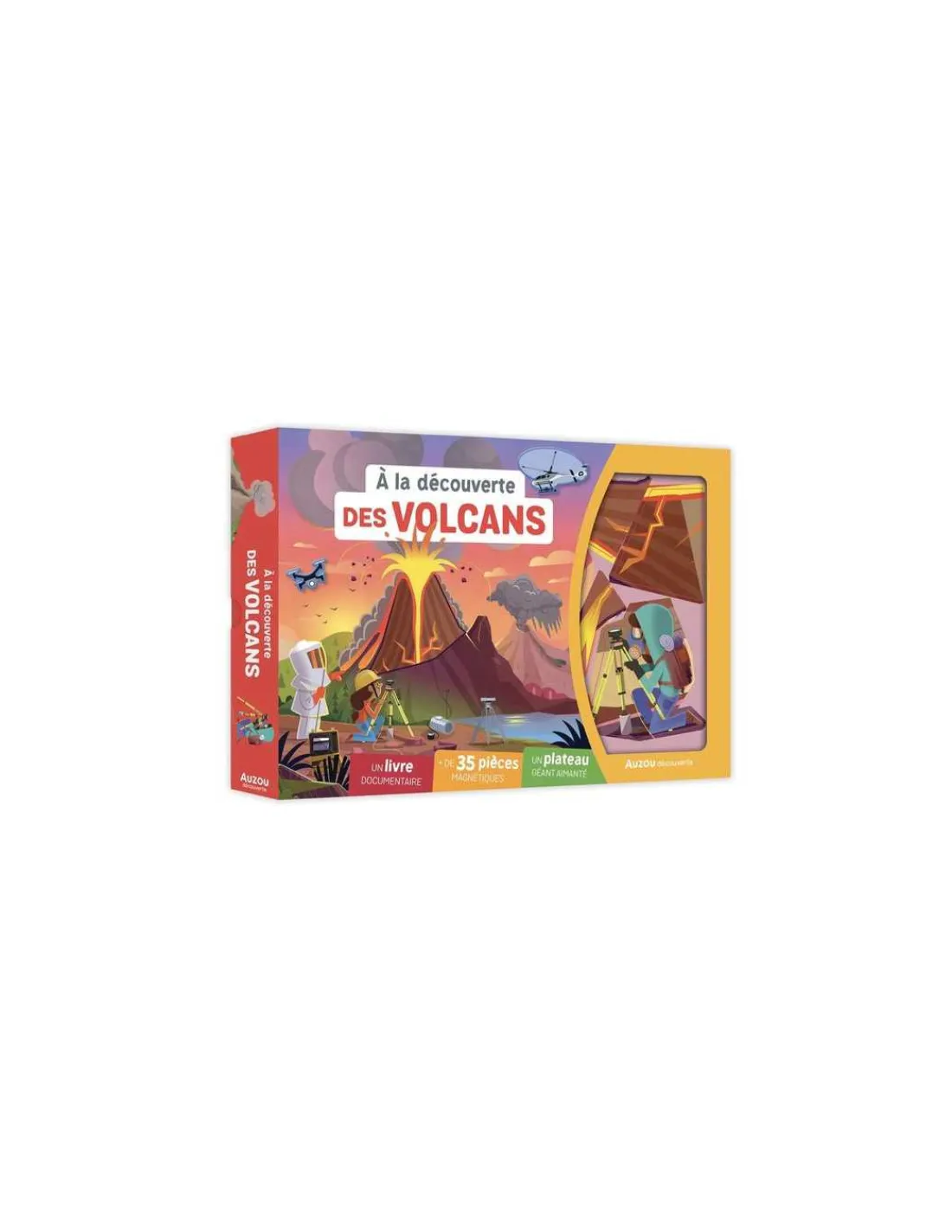 Ce coffret complet comprend un livre documentaire de 64 pages richement illustré et documenté, pour tout savoir sur les volcans : leur formation, les différents types d’éruptions, les zones volcaniques célèbres, et bien plus encore. Vous trouverez également un grand plateau aimanté accompagné de 35 aimants permettant de reconstituer l’intérieur d’un volcan en activité, une éruption volcanique, les tenues des vulcanologues…