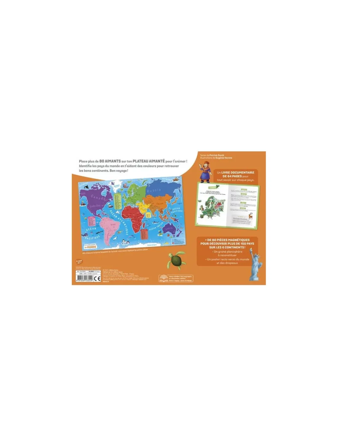 Il propose un livret documentaire de 64 pages pour tout savoir sur les pays, un grand plateau aimanté et 80 aimants pour l’animer.