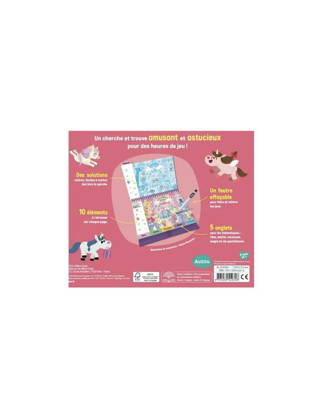 Un cahier de jeux avec 5 thématiques féériques autour de l’univers des licornes : rêve, amitié, vacances, magie et vie quotidienne. Un élément récurrent à retrouver sur chaque page et plus de 200 détails à trouver !