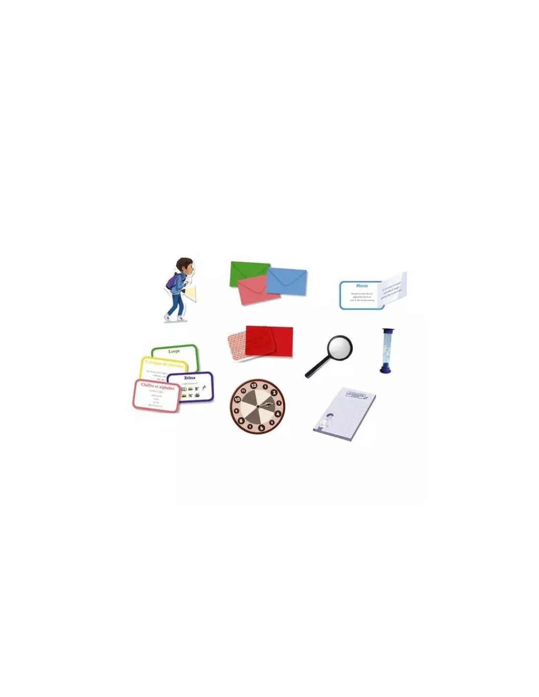 La boite de jeu contient 1 plateau-château en 3D, des accessoires de détectives pour décoder les énigmes : loupe, carte miroir, morse, filtre rouge, 1 pion Max & Enzo en carton, 1 carnet de détective, 1 règle du jeu.