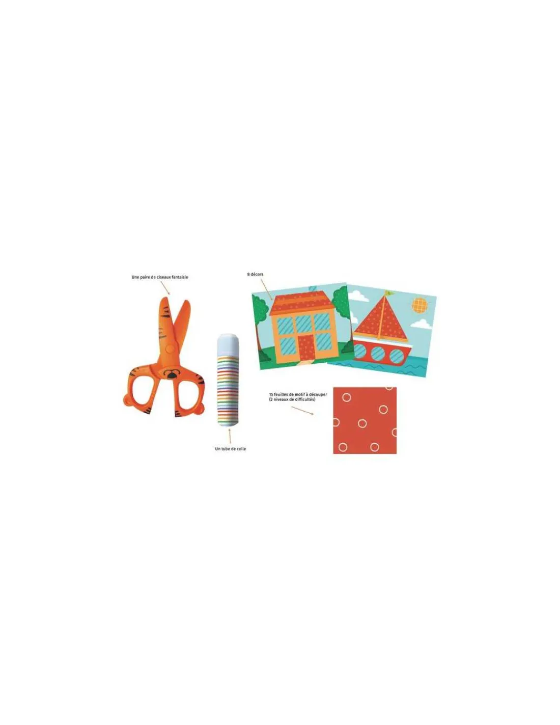 À l’aide d’une paire de ciseaux fantaisie incluse, les enfants peuvent découper des formes simples sur 15 feuilles de motif, puis les coller sur 8 décors attrayants à l’aide du bâton de colle fourni. Conçu pour être évolutif, ce coffret propose deux niveaux de difficulté afin d’accompagner les petits artistes dans leur progression.