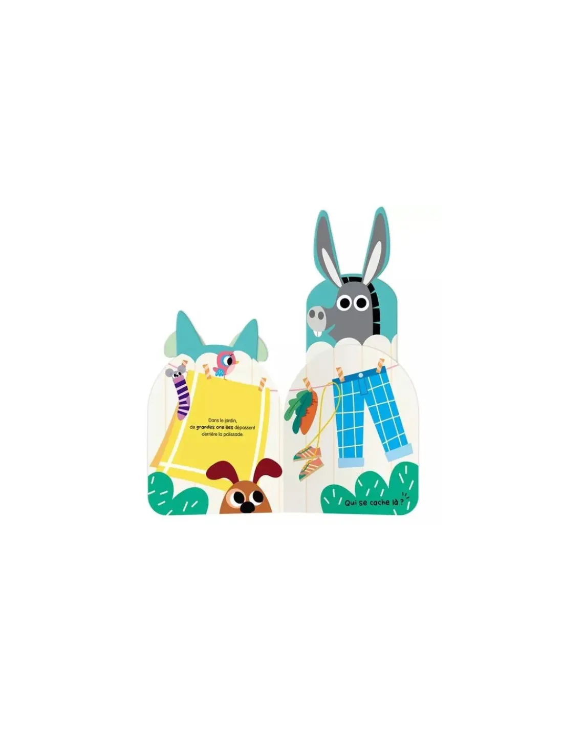 4 paires d’oreilles et 1 queue d’animal dépassent de ce livre animé en carte épaisse… Qui se cache là ? Lorsque l’enfant tire sur une paire d’oreilles, la tête de l’animal sort et déclenche un son : le cri de l’animal correspondant.