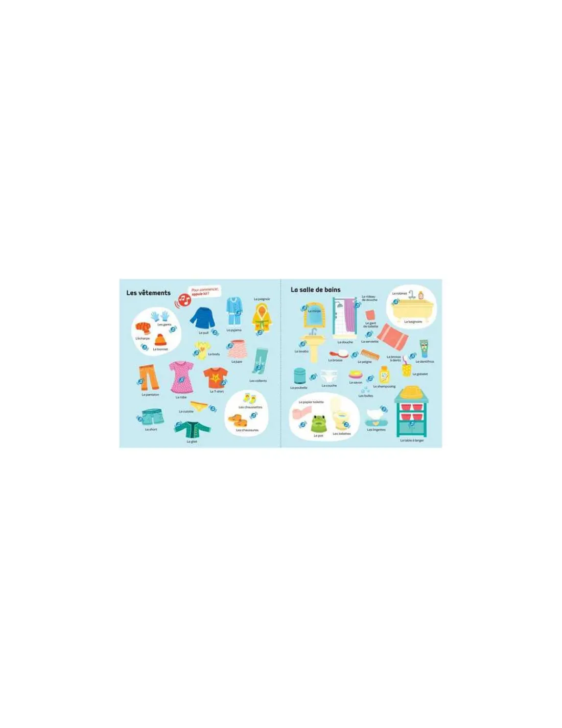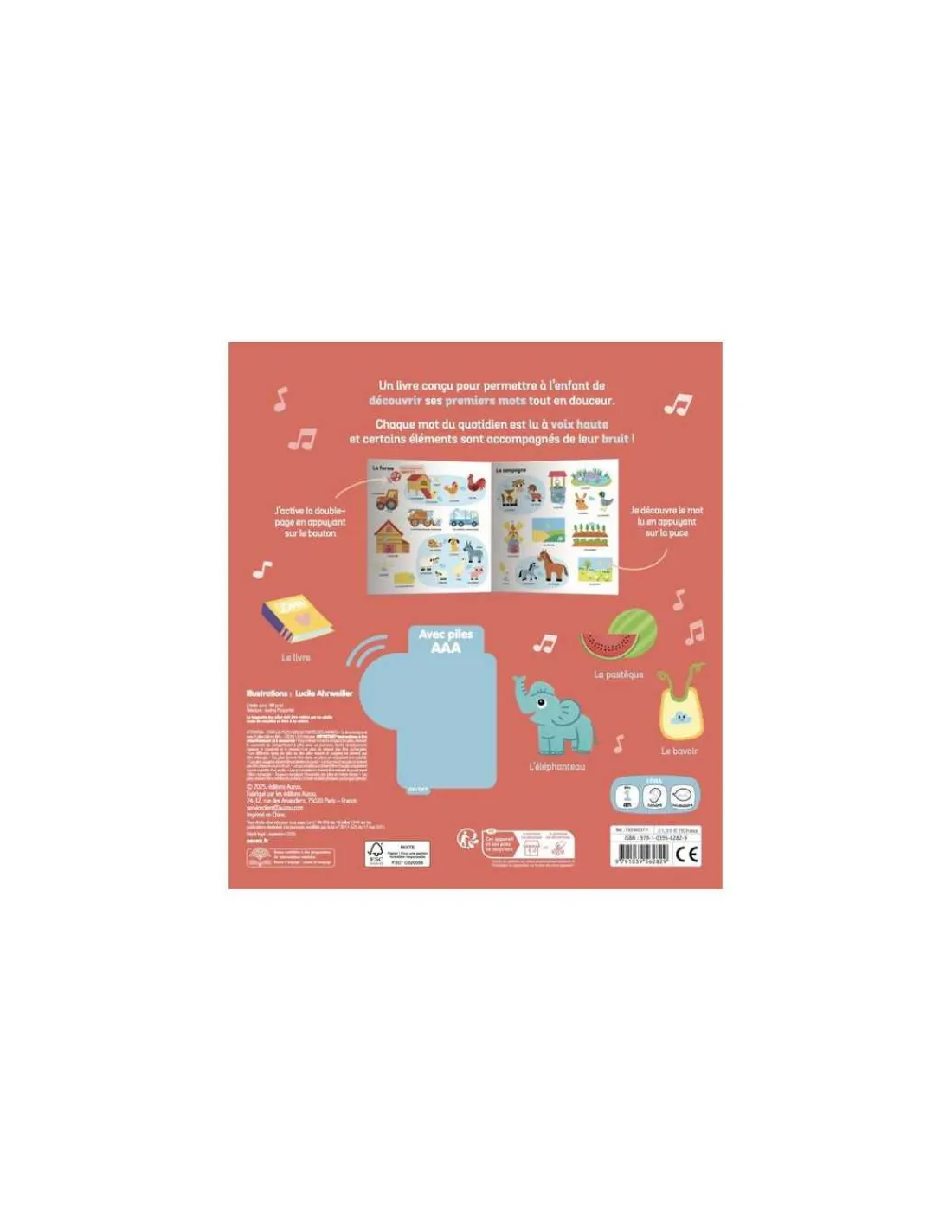 Un livre conçu pour permettre à l’enfant de découvrir ses premiers mots de façon ludique. Chaque mot du quotidien est lu à voix haute, et 50 d’entres eux sont accompagnés de leur bruit. Un livre sonore avec des piles AAA.