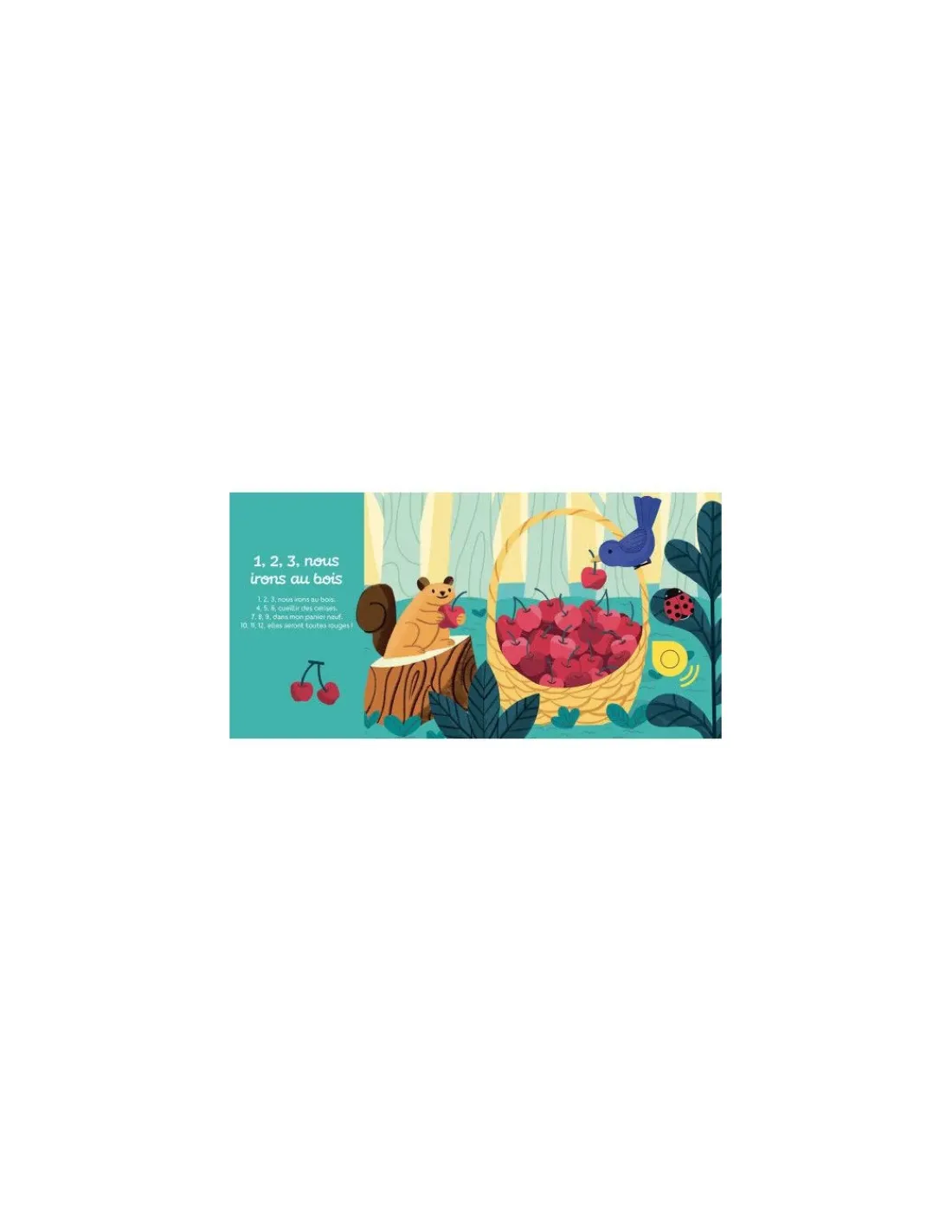 Un livre musical à mettre entre les mains des enfants en toute autonomie ou à partager joyeusement. En appuyant sur les puces sonores, votre enfant pourra écouter « 1, 2, 3, nous irons au bois », « Violette à bicyclette », « 1, 2, 3, le chat », « Un ciel bleu », « Voici ma main » et « 1, 2, mon cheval ».