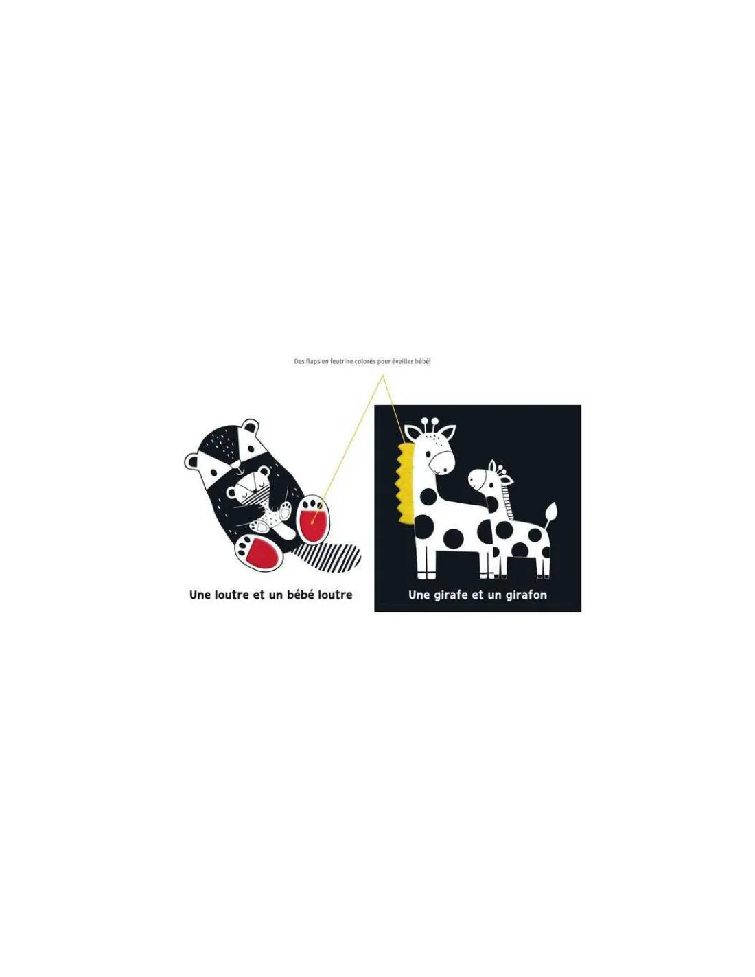 Votre enfant découvrira l’univers des bébés animaux à travers un imagier en noir et blanc, indispensable à son développement. Des flaps en feutrine colorés aide bébé à développer sa motricité. Leurs couleurs contrastent avec les illustrations en noir et blanc, qui attirent ainsi l’attention du bébé dont la vision est en plein développement
