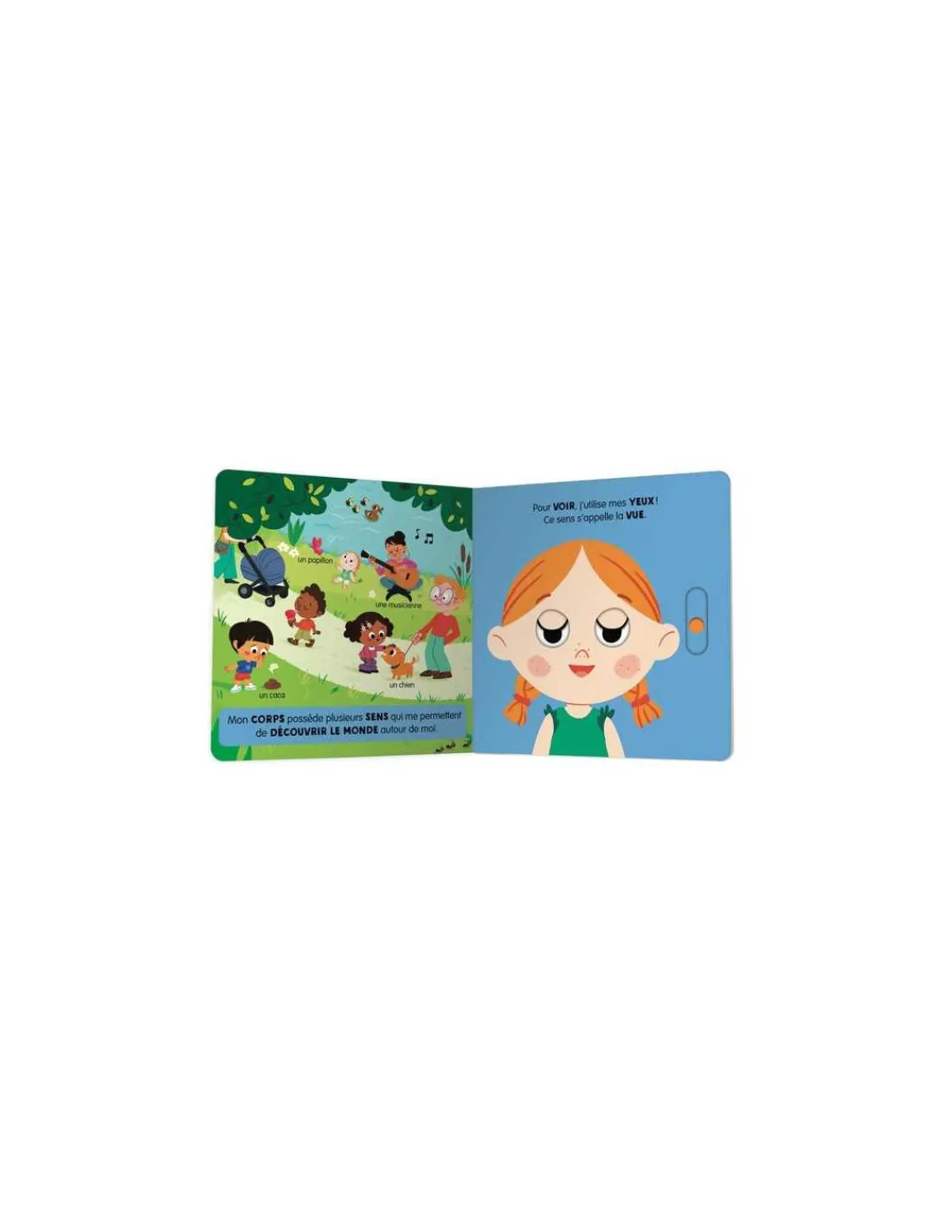 On retrouve 5 mécanismes solides, logiques et adaptés aux petites mains, faciles à manipuler, et une double page finale qui récapitule les sens de façon ludique, grâce à un jeu de flaps.