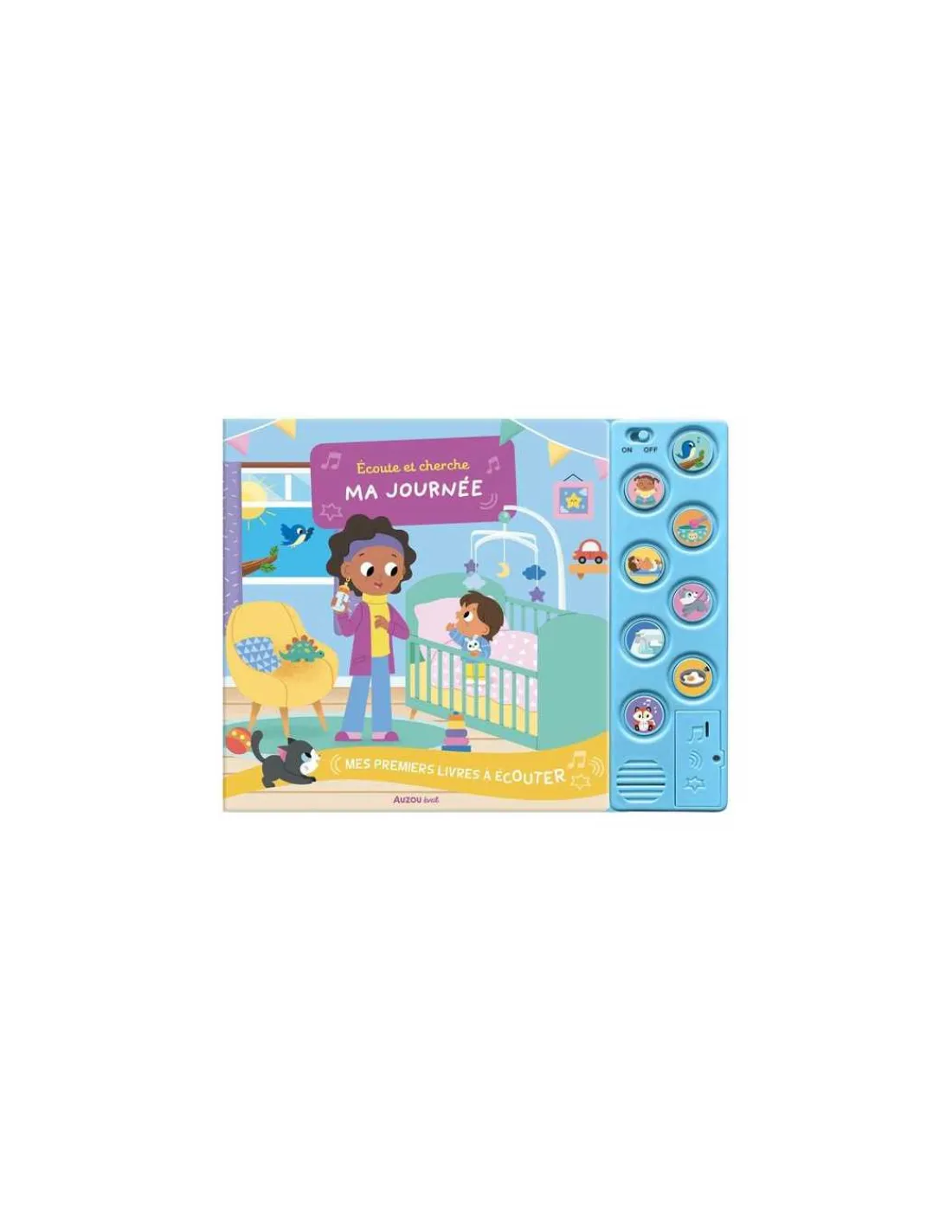Découvrez le livre sonore Écoute et cherche Ma journée de Auzou, un livre musical de 18 pages pour les enfants à partir de 1 an, qui regroupe 8 sons à écouter.