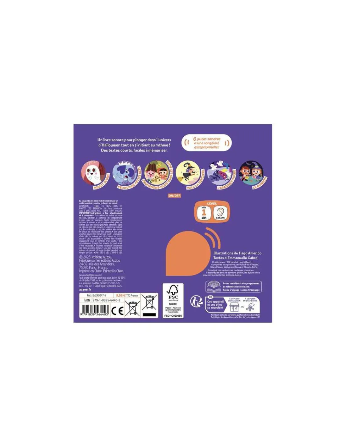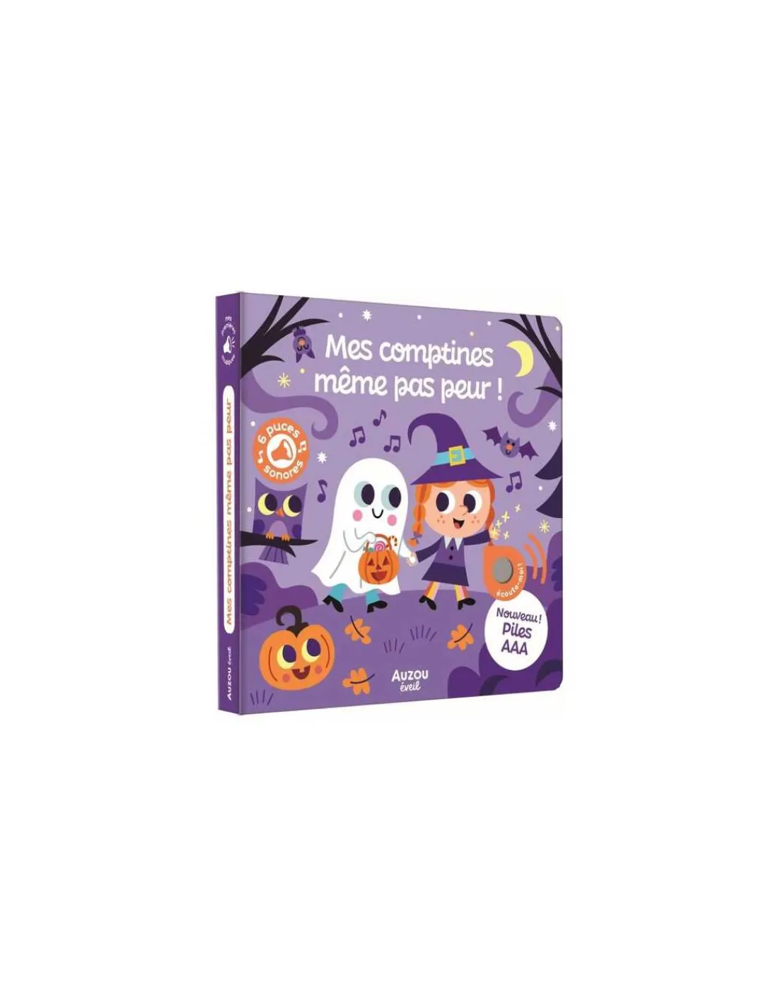 Découvrez le livre sonore Mes comptines même pas peur de Auzou, un livre sonore de 12 pages pour les enfants à partir de 1 an, qui regroupe 6 comptines courtes et faciles à mémoriser pour s’endormir au rythme des plus belles comptines sur le thème d’Halloween.
