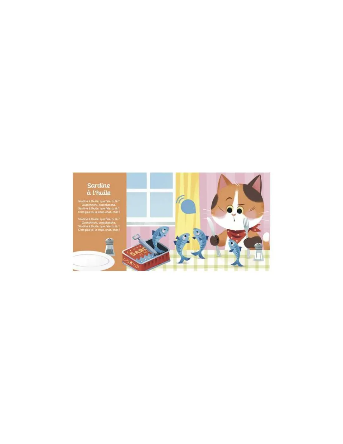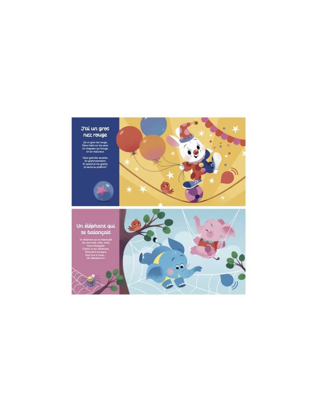 Un livre musical avec des textes courts et faciles à mémoriser comprenant 6 comptines pour rigoler : J’ai un gros nez rouge, Un éléphant qui se balançait, Le bon roi Dagobert, Sardine à l’huile, Maman les p’tits bateaux et Un petit cochon.