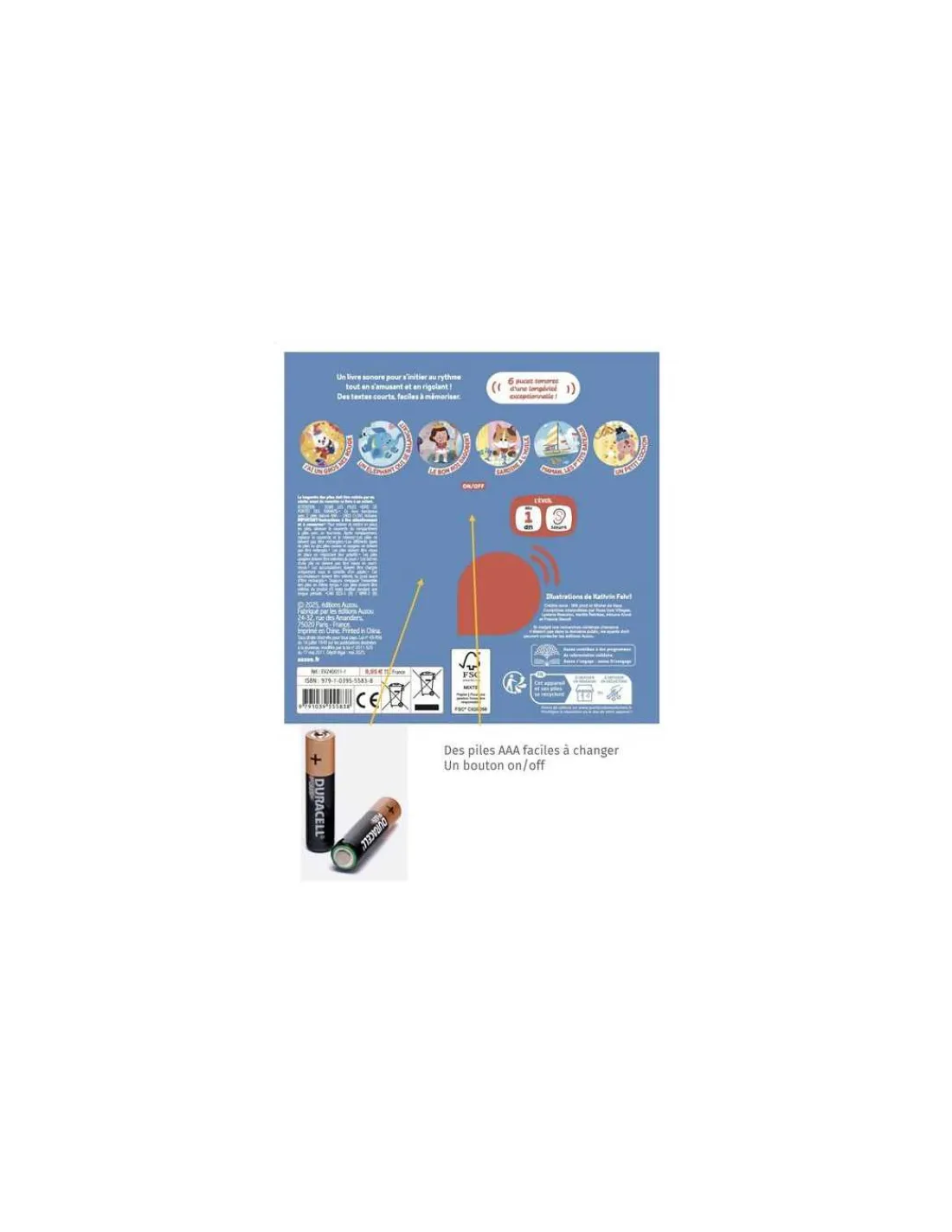 Le livre contient un bouton on/off (pour durer plus longtemps) et des piles AAA (faciles à changer).