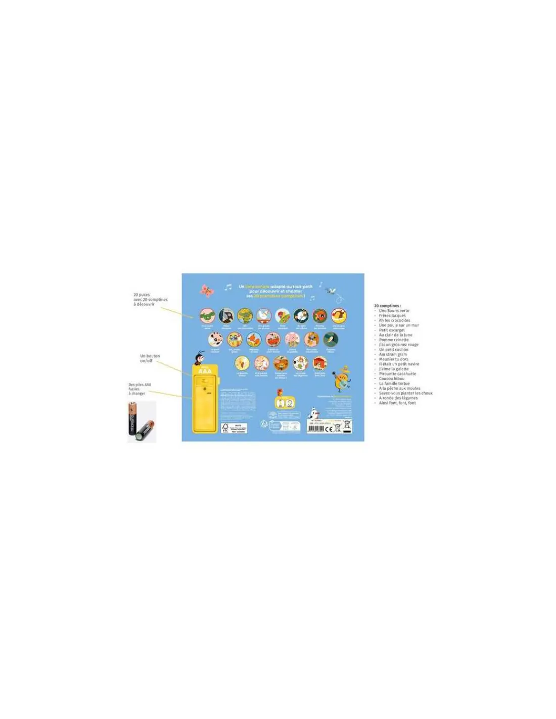 Ce livre interactif propose 20 puces sonores, chacune diffusant une comptine classique et incontournable, totalisant plus de 6 minutes d’écoute. Parfait pour l’éveil musical des jeunes enfants, ce livre offre une expérience auditive remarquable.