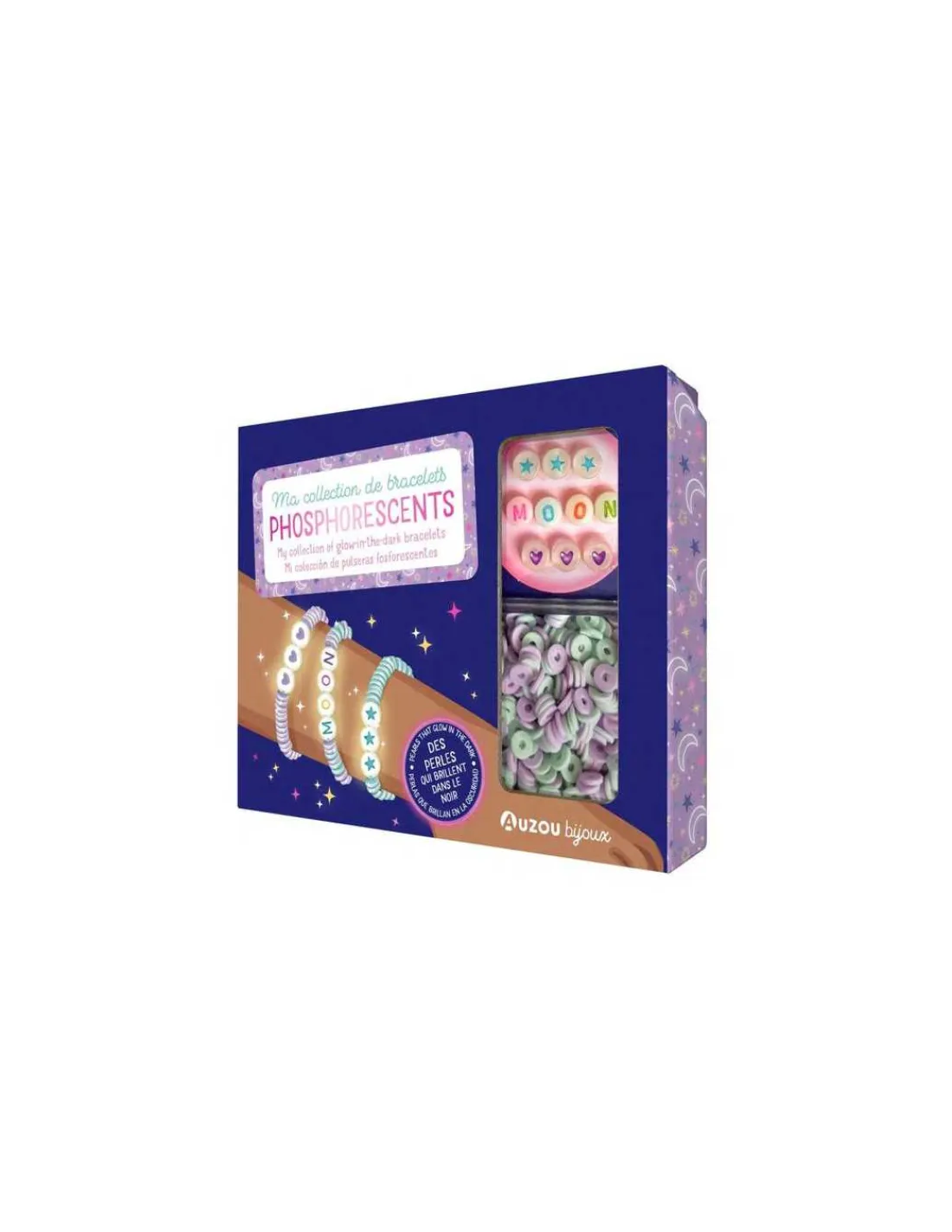 Le coffret comprend 11 perles phosphorescentes (étoiles, cœurs, lettres), des perles heishi et une boîte pour les ranger.