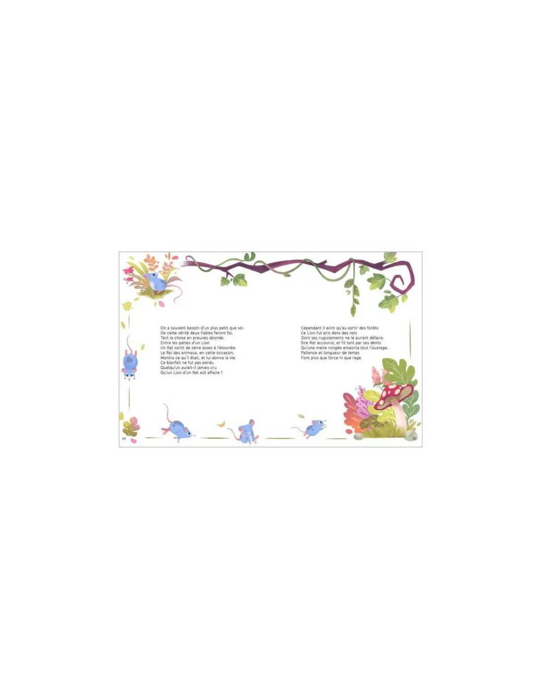 L’étui cartonné, tout en dorure, propose 10 livres reliés en couverture souple avec 10 fables : La Cigale et la fourmi, Le chêne et le roseau, Le corbeau et le renard, La grenouille et le boeuf, La laitière et le pot au lait, Le lion et le rat, Le loup et l’agneau, Le rat des villes et le rat des champs, Le renard et la cigogne et Le lièvre et la tortue.