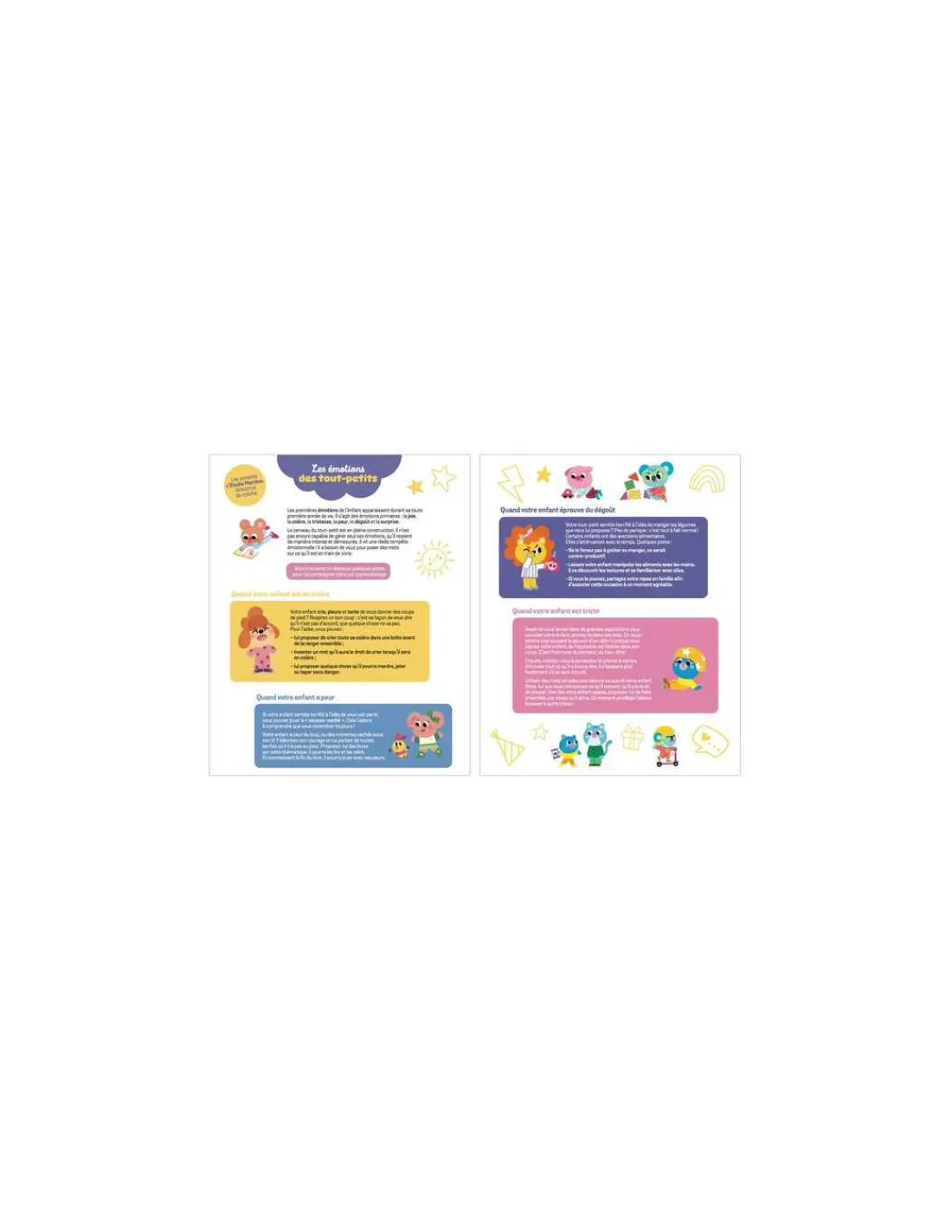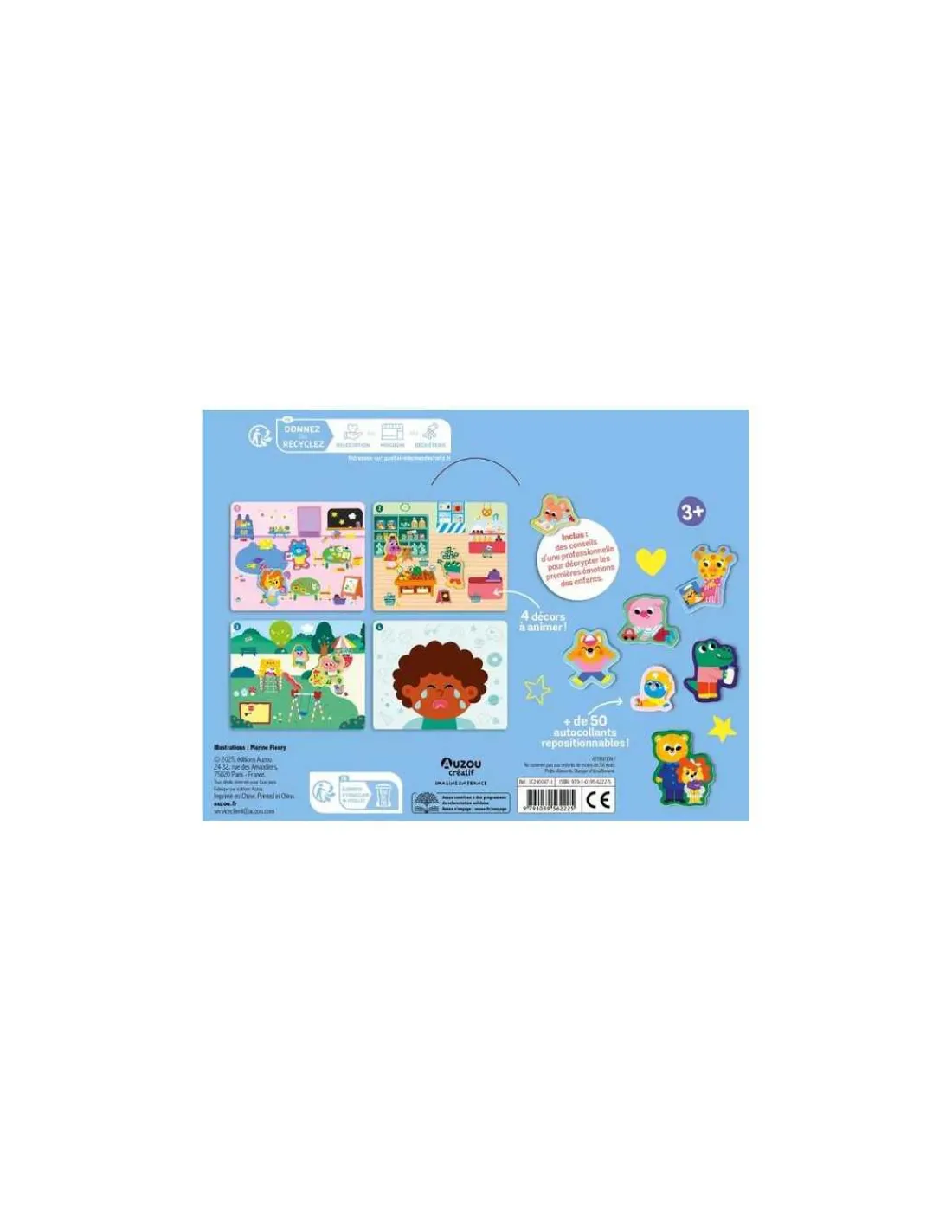 Plus de 50 autocollants repositionnables à replacer sur les 4 décors avec les conseils d’une professionnelle pour décrypter les premières émotions des enfants.