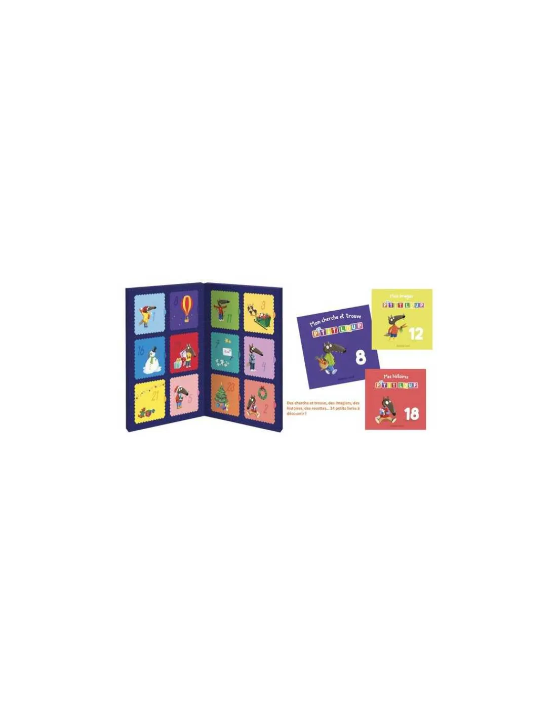 En format 11 x 11 cm, en piqué métal, 24 petits livres pour patienter en attendant Noël avec des histoires, des « cherche et trouve » , des activités et des imagiers.