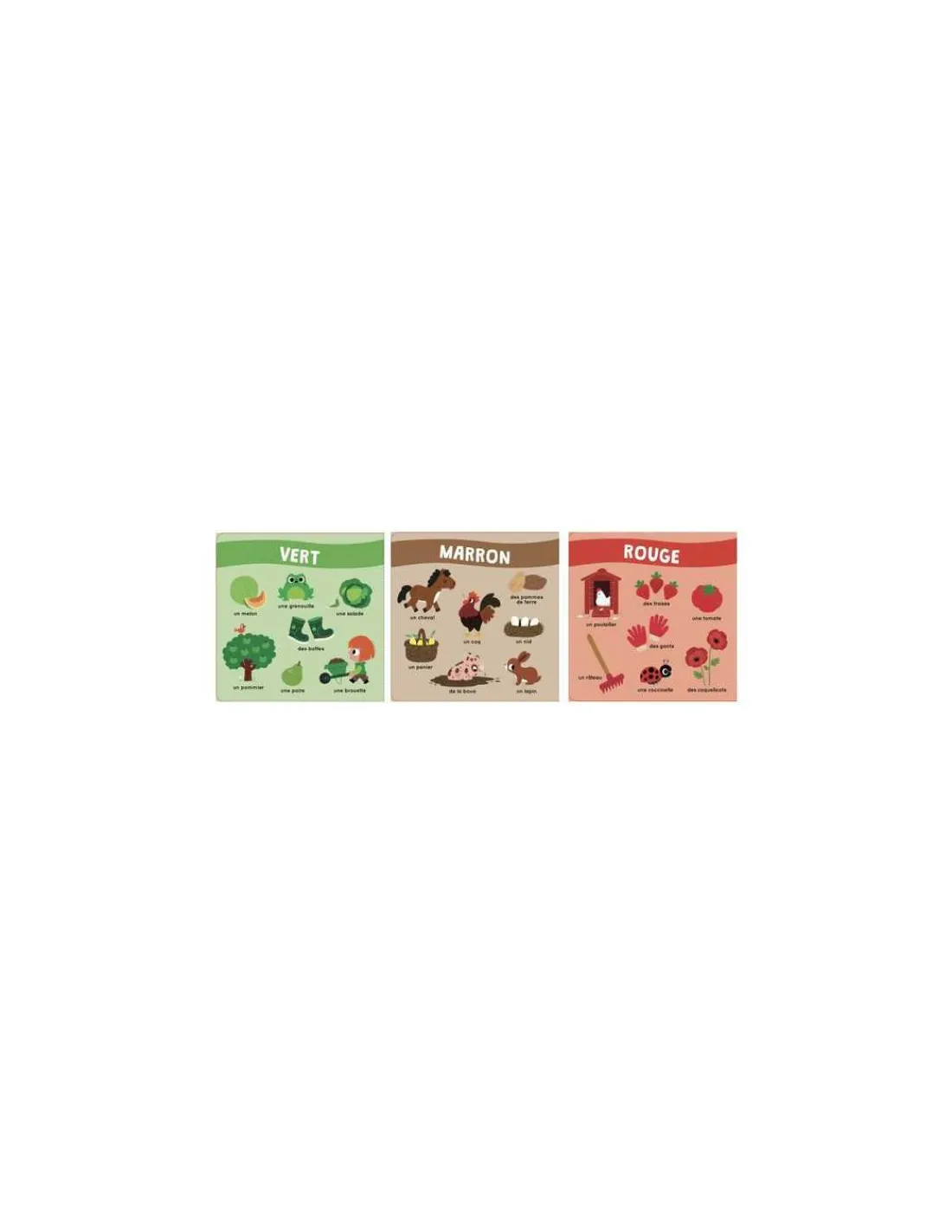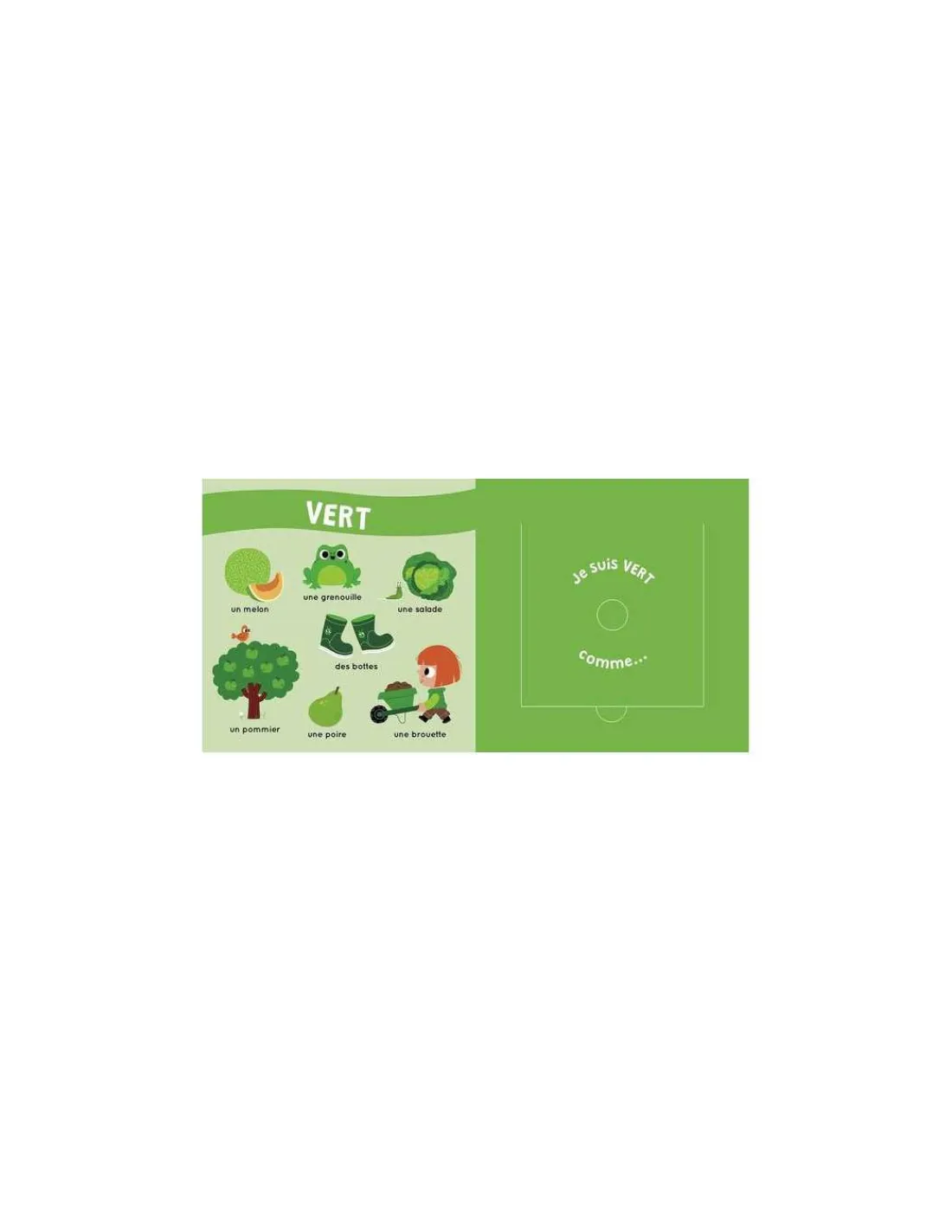Chaque page de gauche présente une couleur grâce à de jolies illustrations simples et enfantines, mais que se cache-t-il derrière le rabat? En frottant son doigt, l’enfant y découvrira l’odeur de la ferme de la couleur de la page. 7 parfums du jardin: le lait, la pomme, le concombre, les champignons, le miel, les oignons et la mare.