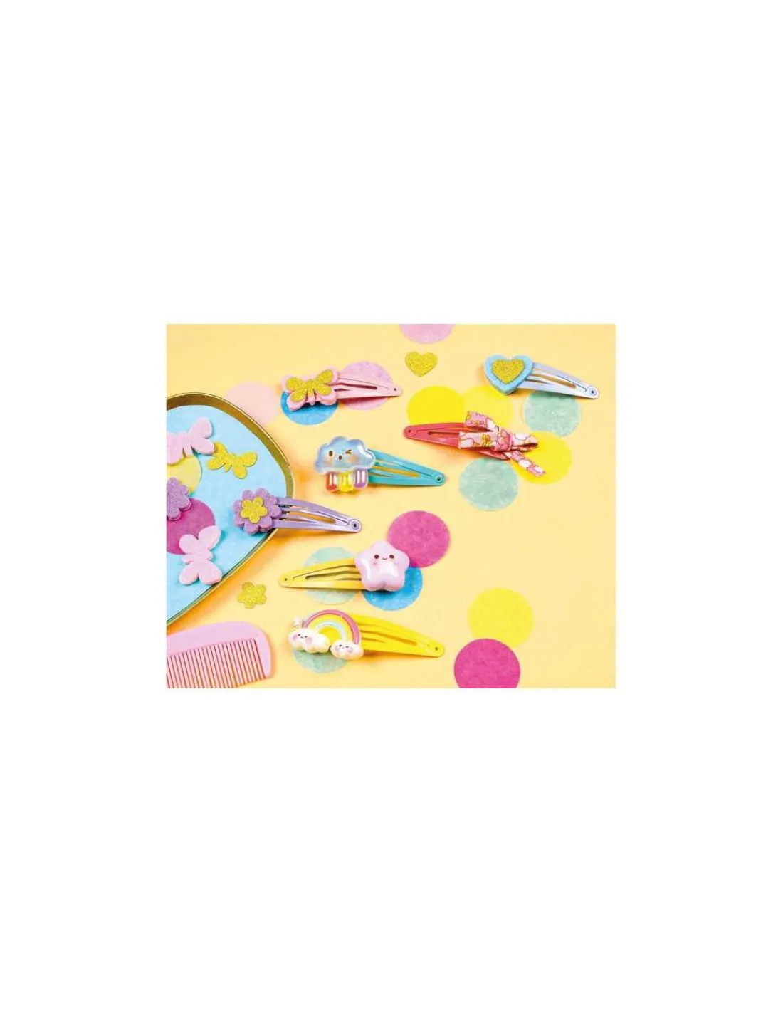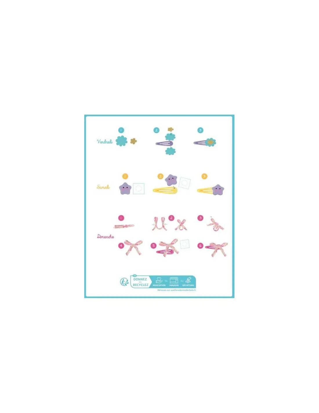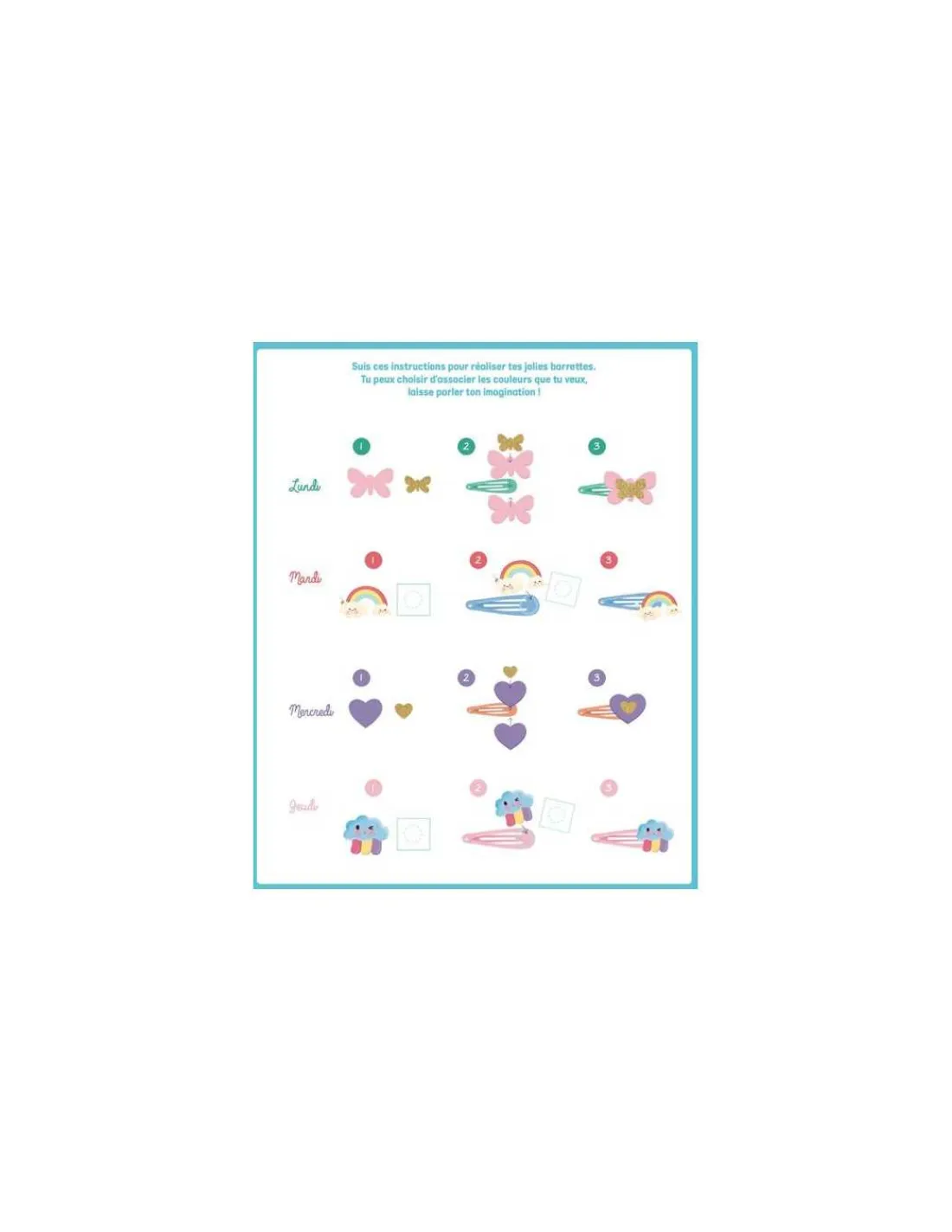 Un semainier de 7 barrettes à réaliser, pour orner ses cheveux d’une création différente à chaque jour de la semaine ! Les 7 supports sont de 7 couleurs différentes. Rubans, feutrine, charms fantaisie… les modèles sont aussi variés que tendance !