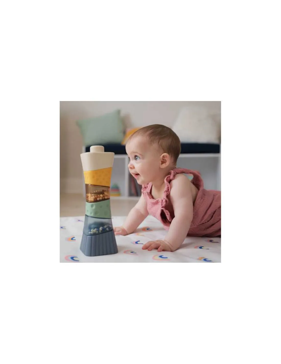 Composée de différentes parties aux couleurs vives et aux textures variées, la tour combine des éléments souples et durs pour éveiller le toucher. Certaines pièces renferment des perles colorées visibles à travers des jeux de transparence, créant des effets visuels captivants. Lorsque bébé agite ou empile les pièces contenant des perles, un doux son de pluie se fait entendre, ajoutant une dimension sonore apaisante et amusante.