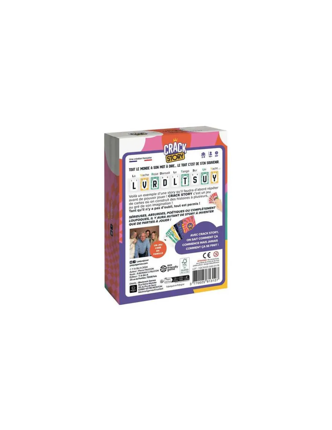 Dans Crack Story, les joueurs construisent ensemble et tour par tour une STORY en utilisant leurs cartes comme premières lettres des mots qu’ils ajoutent. Pour ajouter un mot, il faut d’abord répéter la Story depuis le début sans se tromper.