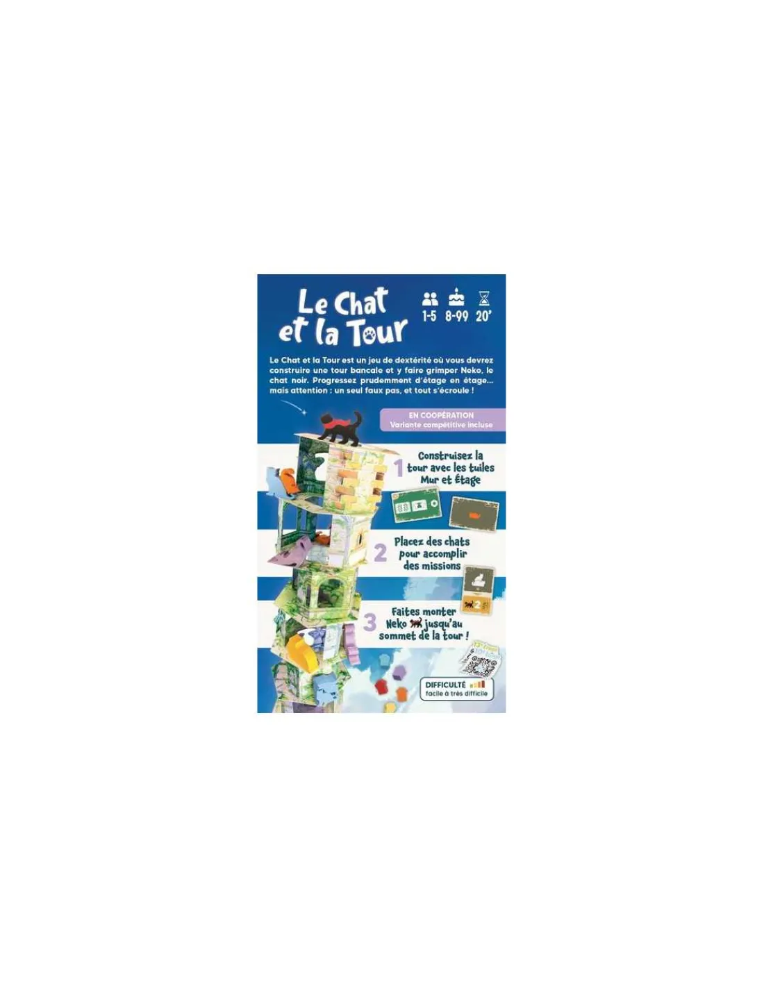 Les joueurs construisent ensemble la tour avec des tuiles Mur et Étage. Des cartes Mission demandent de placer certains chats colorés sur l’étage au-dessus de celui où se trouve Neko (ex. : deux chats de couleurs différentes doivent se toucher).
