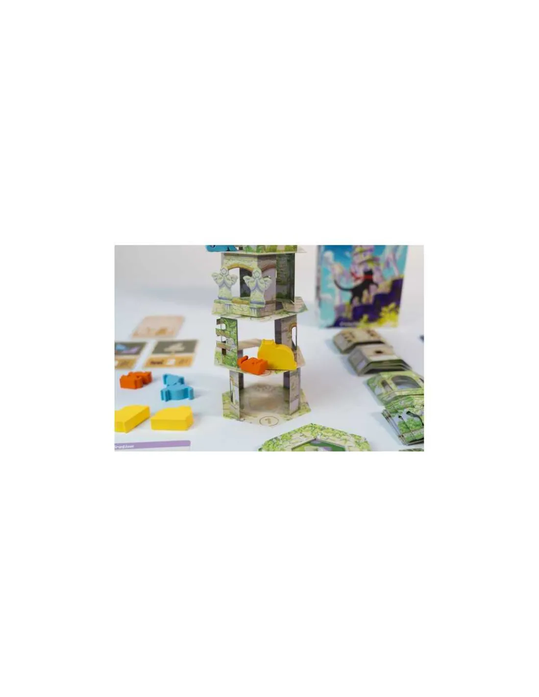 La boite de jeu contient 54 tuiles Mur, 24 tuiles Étage, 21 pions en bois Chat, 36 cartes de jeu, 5 jetons en bois Patte, 5 stickers Palier, 1carte Référence et la règle du jeu.