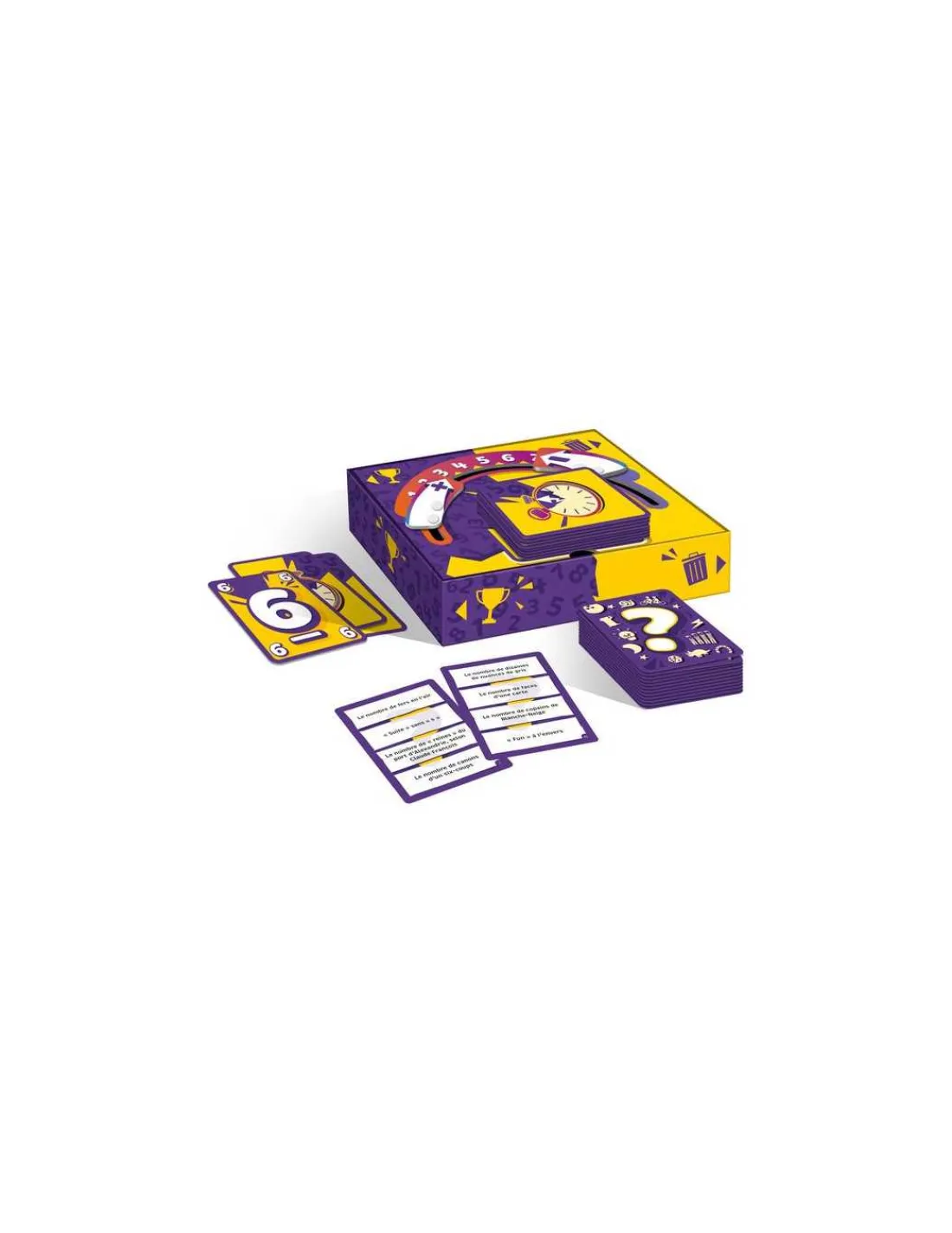 La boite de jeu contient 18 cartes « Chiffre », 182 cartes « Questions », 1 plateau avec 2 flèches mobiles et la règle du jeu.