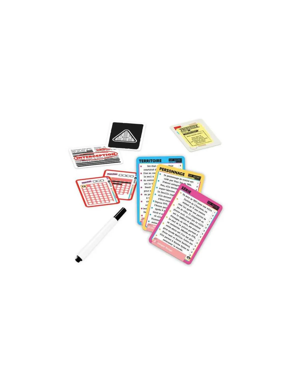 La boite de jeu contient 264 cartes, 8 feutres effaçables, 5 lavettes, 1 étui de transport et la règle du jeu.