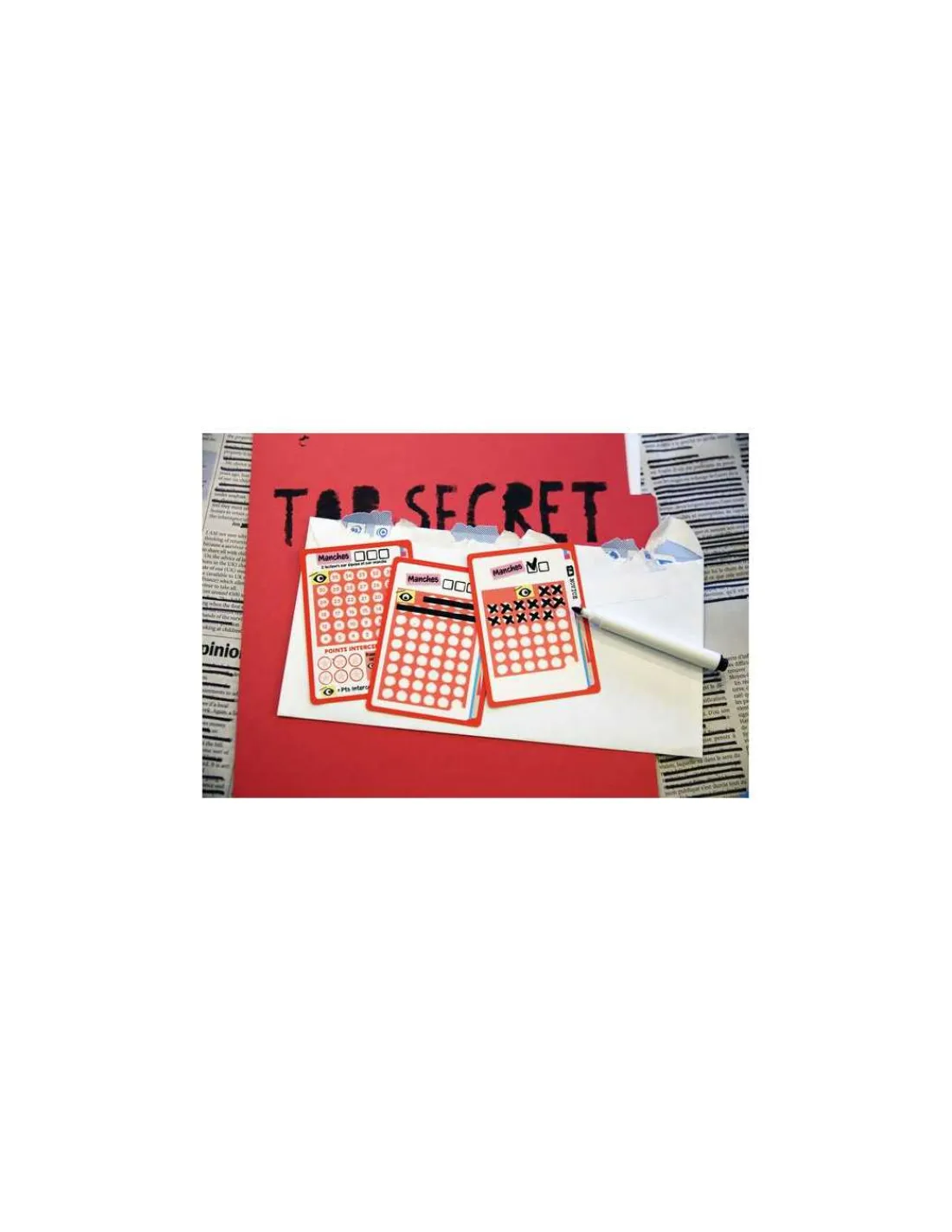 Essayez de faire deviner le contenu de votre document classifié en dissimulant certaines informations. Pour cela, rayer les éléments inutiles sur votre carte et lisez à haute voix ce qui reste. Veillez cependant à ne pas trop simplifier les indices : il est important de fournir suffisamment de détails pour que vos coéquipiers puissent deviner avec précision. Le vrai défi consiste à trouver le juste milieu entre l’occultation d’informations et la préservation d’indices clairs pour mener votre équipe à la bonne réponse!