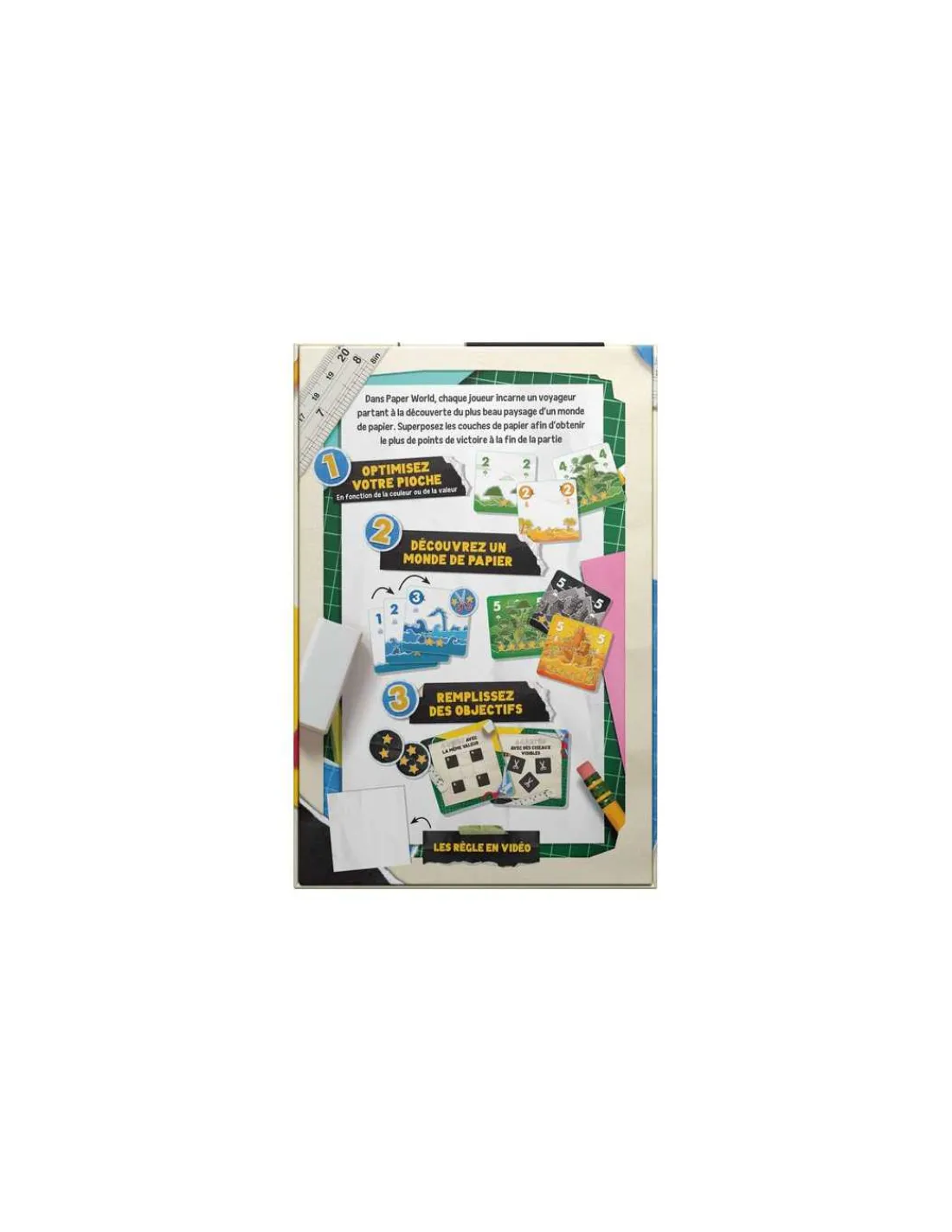 Dans Paper World, chaque joueur incarne un voyageur tentant de reconstituer les paysages qu’il a vu au cours de ses périples avec des couches de papier. Superposez les différentes couches de papier que vous trouvez afin d’avoir le plus de points de victoire possibles à la fin de la partie.