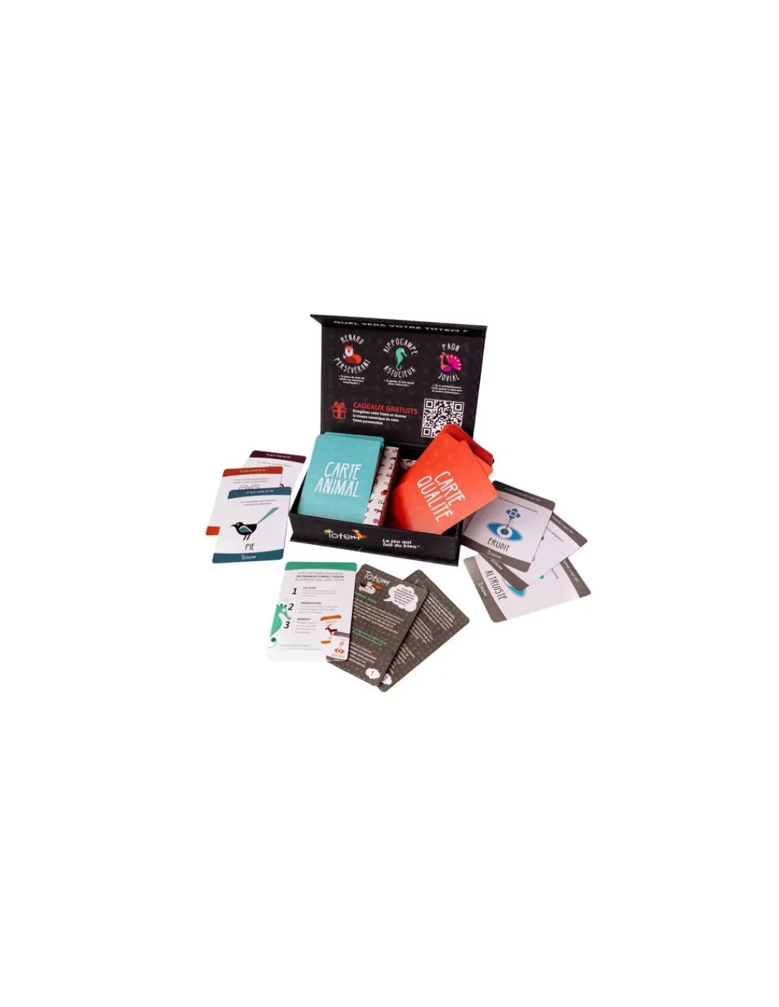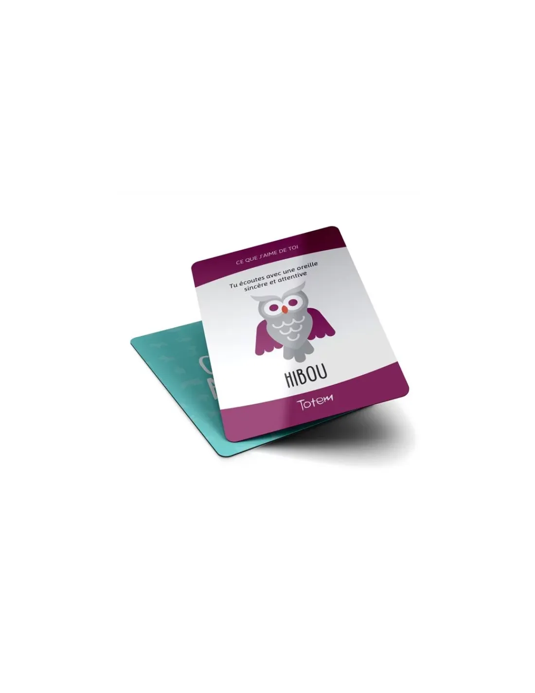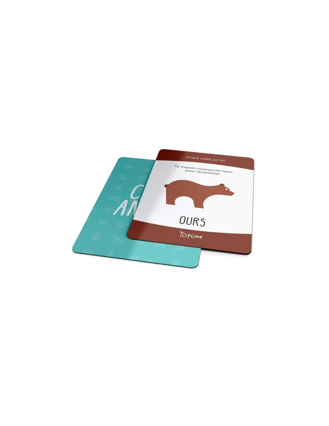 A tour de rôle, chaque joueur assiste à la construction d’un Totem à son image. Celui-ci est constitué d’une carte ANIMAL associée à une force, et d’une carte QUALITÉ, toutes deux choisies et décrites par les autres joueurs. Par exemple, votre Totem pourrait être Aigle Optimiste! L’objectif est de recevoir son Totem et découvrir le meilleur de soi à travers le regard des gens qui nous entourent.