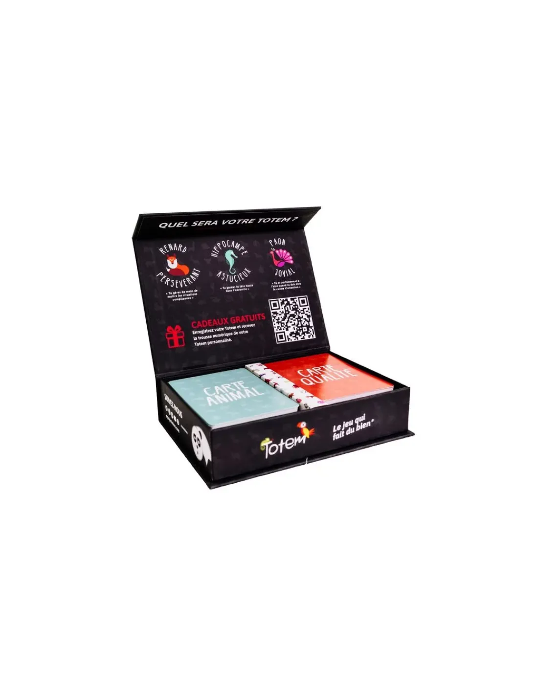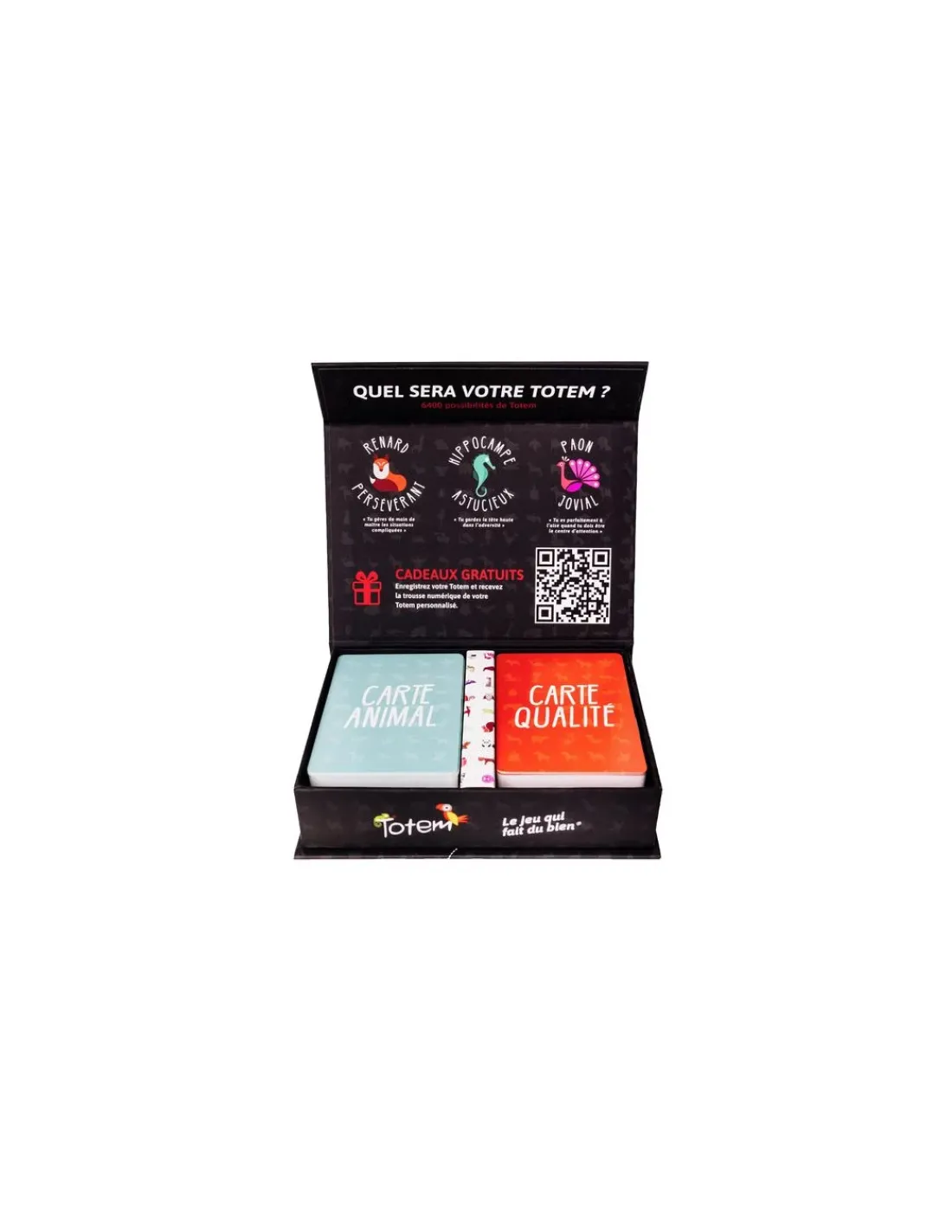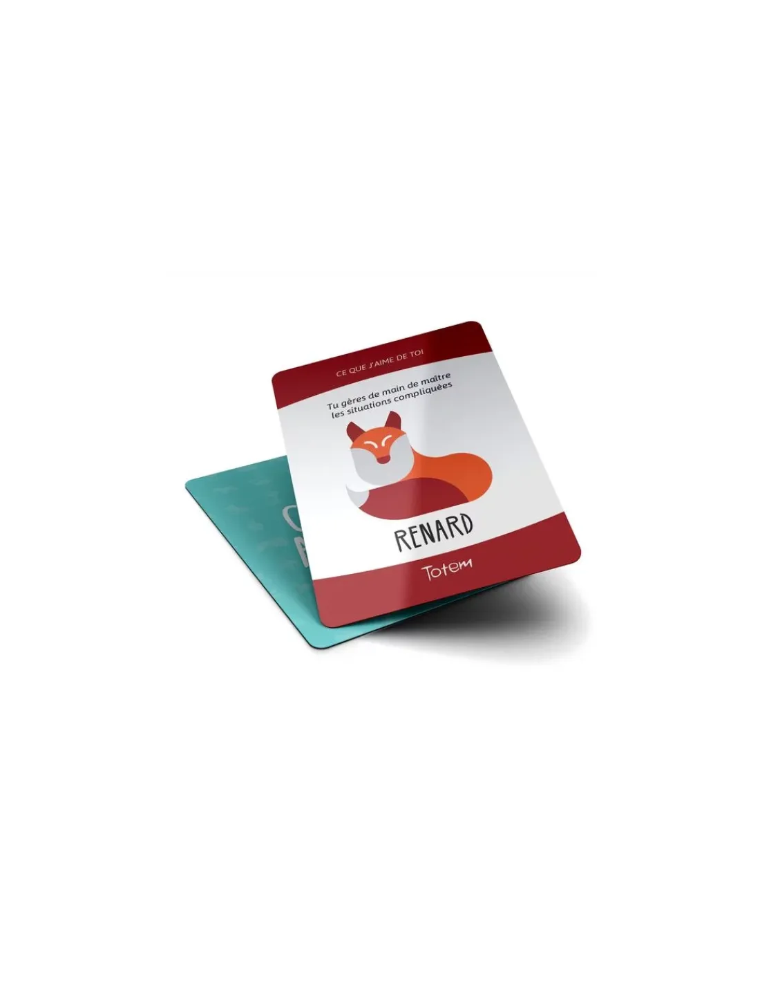 A tour de rôle, chaque joueur assiste à la construction d’un Totem à son image. Celui-ci est constitué d’une carte ANIMAL associée à une force, et d’une carte QUALITÉ, toutes deux choisies et décrites par les autres joueurs. Par exemple, votre Totem pourrait être Aigle Optimiste! L’objectif est de recevoir son Totem et découvrir le meilleur de soi à travers le regard des gens qui nous entourent.