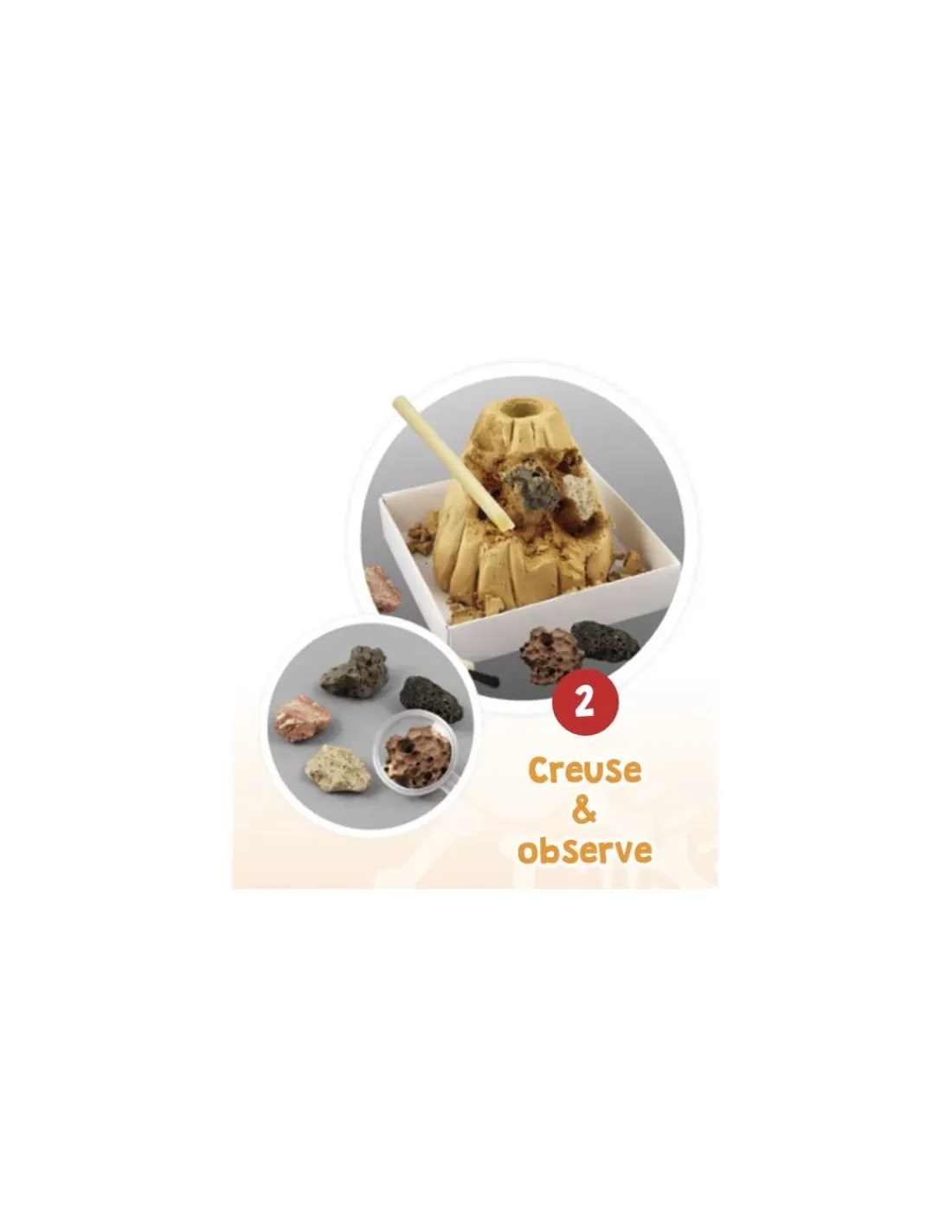 Reproduis une éruption volcanique avec les pastilles incluses. Avec les outils, creuse le volcan pour déterrer 5 pierres volcaniques.
