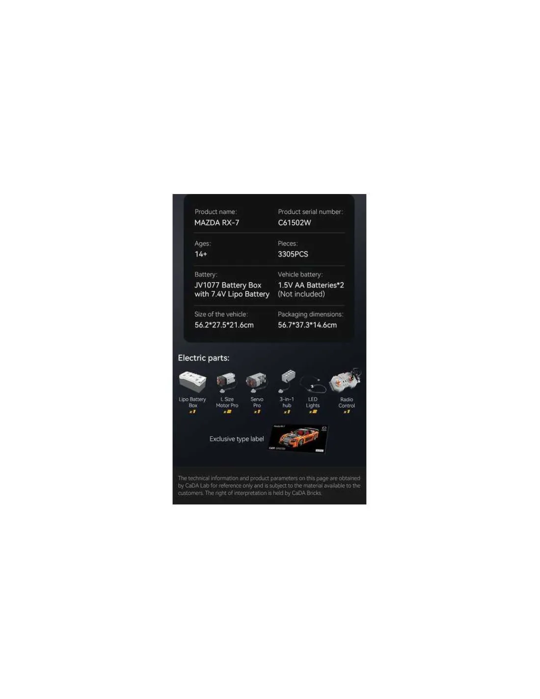 Découvrez le coffret Voiture Mazda RX-7 3305 pièces de CaDA Master, un jeu de construction avec des briques pour réaliser sa voiture de sport radiocommandée (RC) à partir de 14 ans.