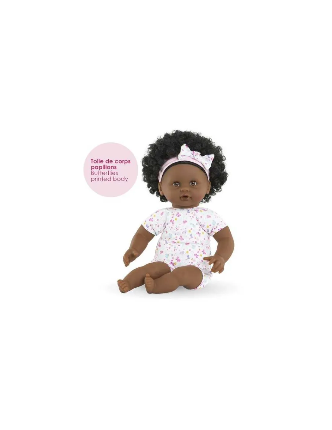 Une fois que l’on a retiré ses vêtements, on peut y découvrir le tissu inédit aux motifs de papillons et de fleurs sur sa toile de corps. Ce poupon est accompagné de deux accessoires : sa tétine et son biberon permettant de bien s’occuper de lui.