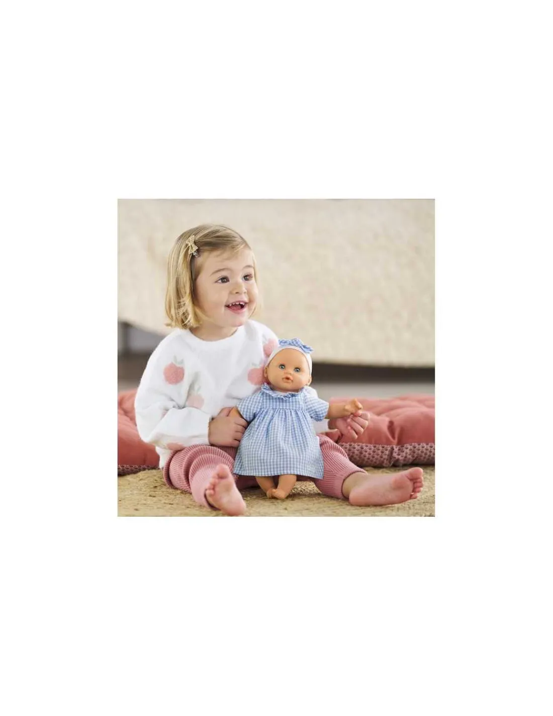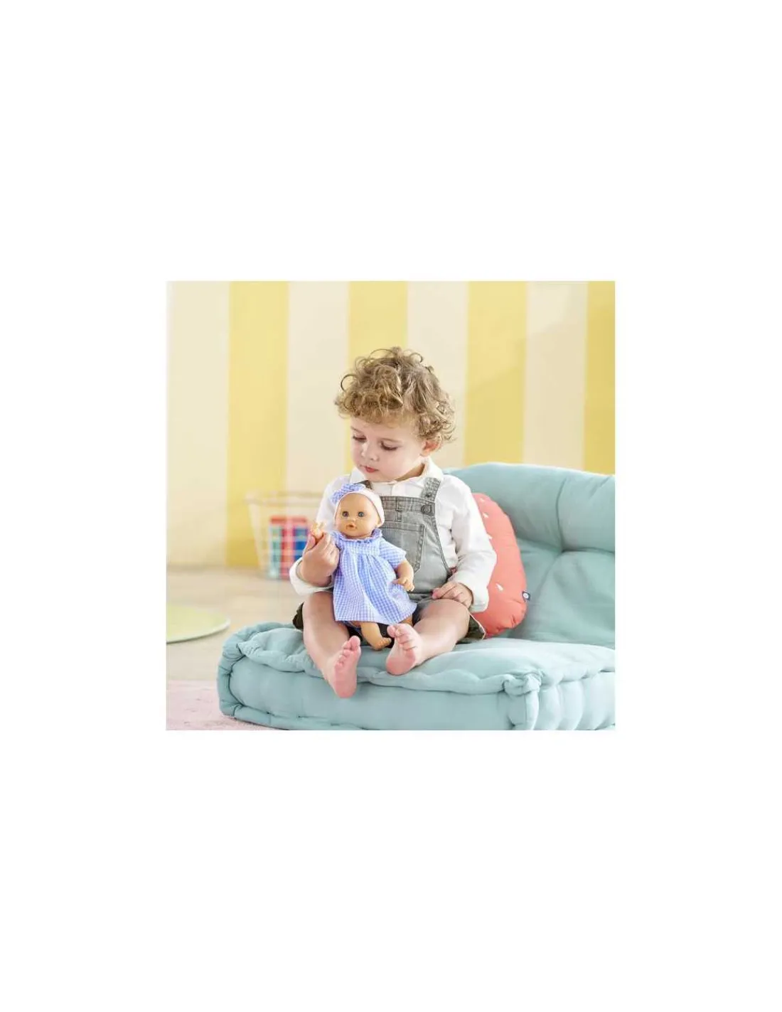 Milly est un petit poupon à la peau blanche et aux yeux bleus. Elle est habillée d’une robe en vichy bleu avec une collerette et coiffé d’un bandeau assorti.