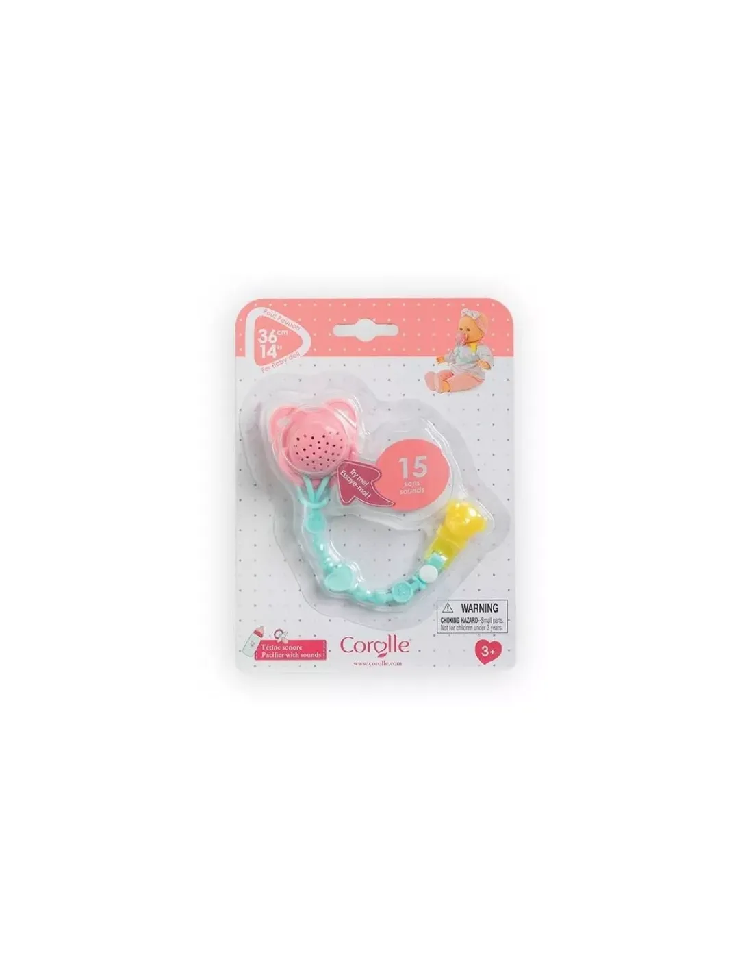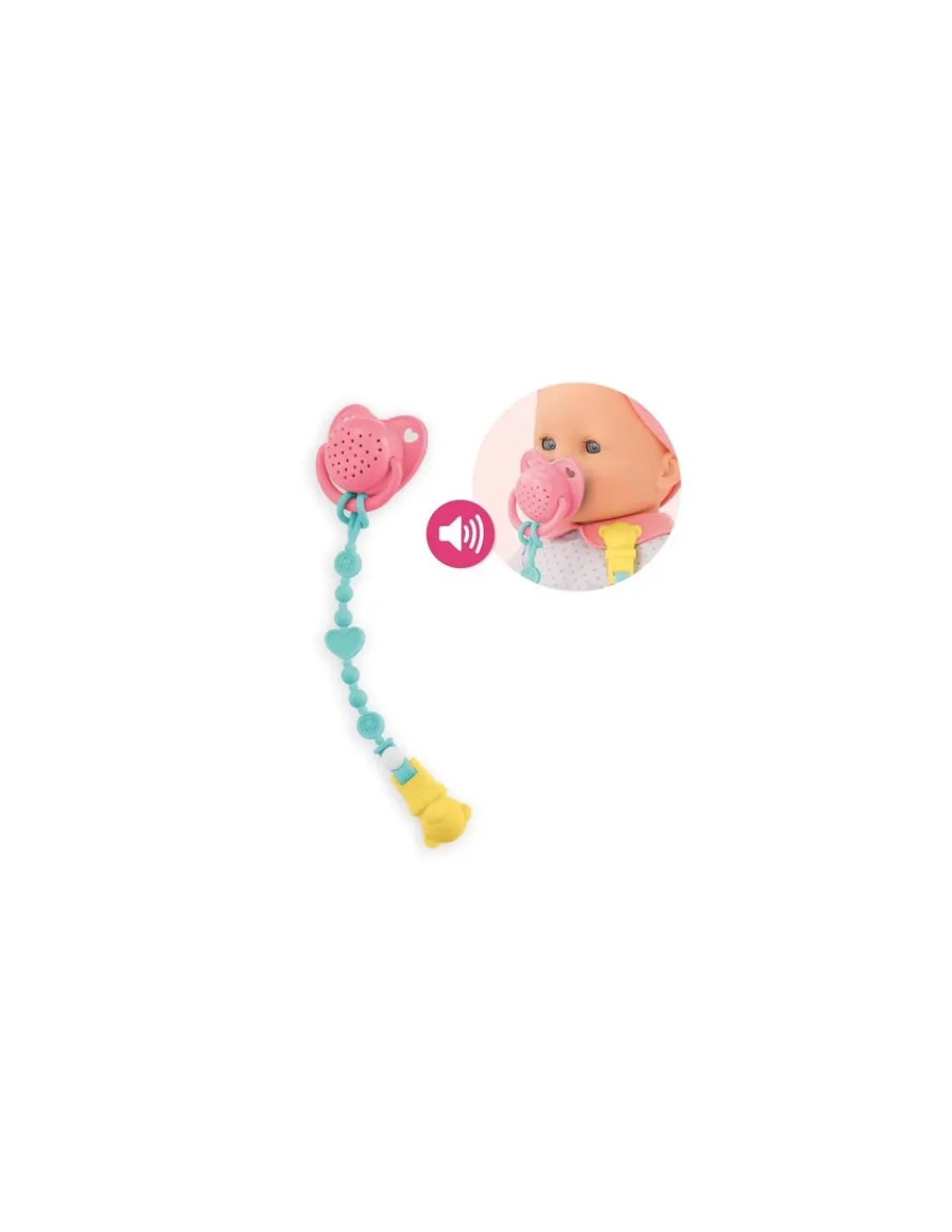 Découvrez la tétine sonore pour poupon de Corolle, un accessoires pour les poupées et les poupons de votre enfant à partir de 3 ans, une tétine avec 15 sons qui se met dans la bouche de votre poupée et qui s’accroche à son vêtement.