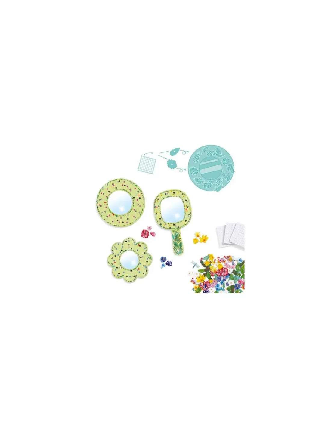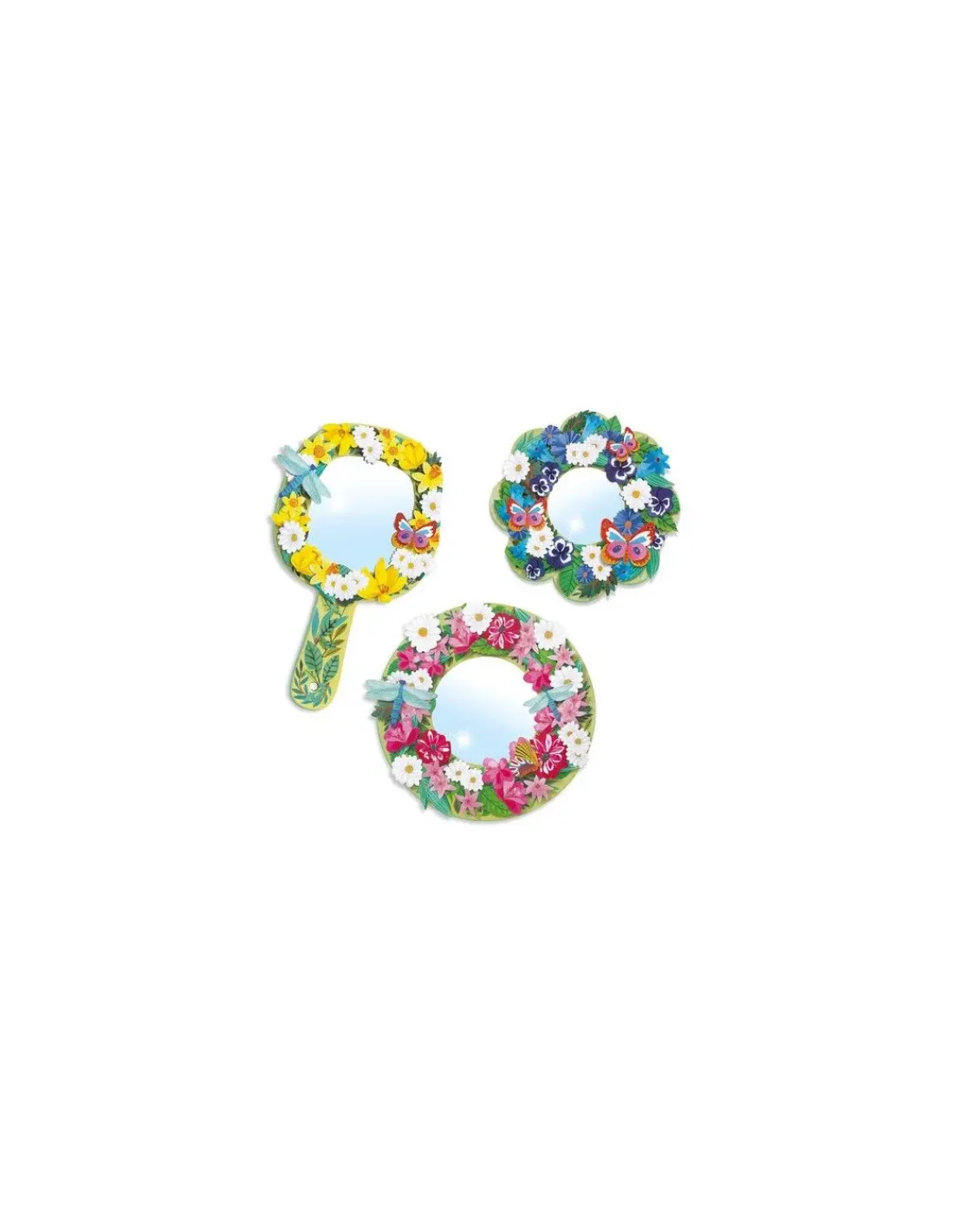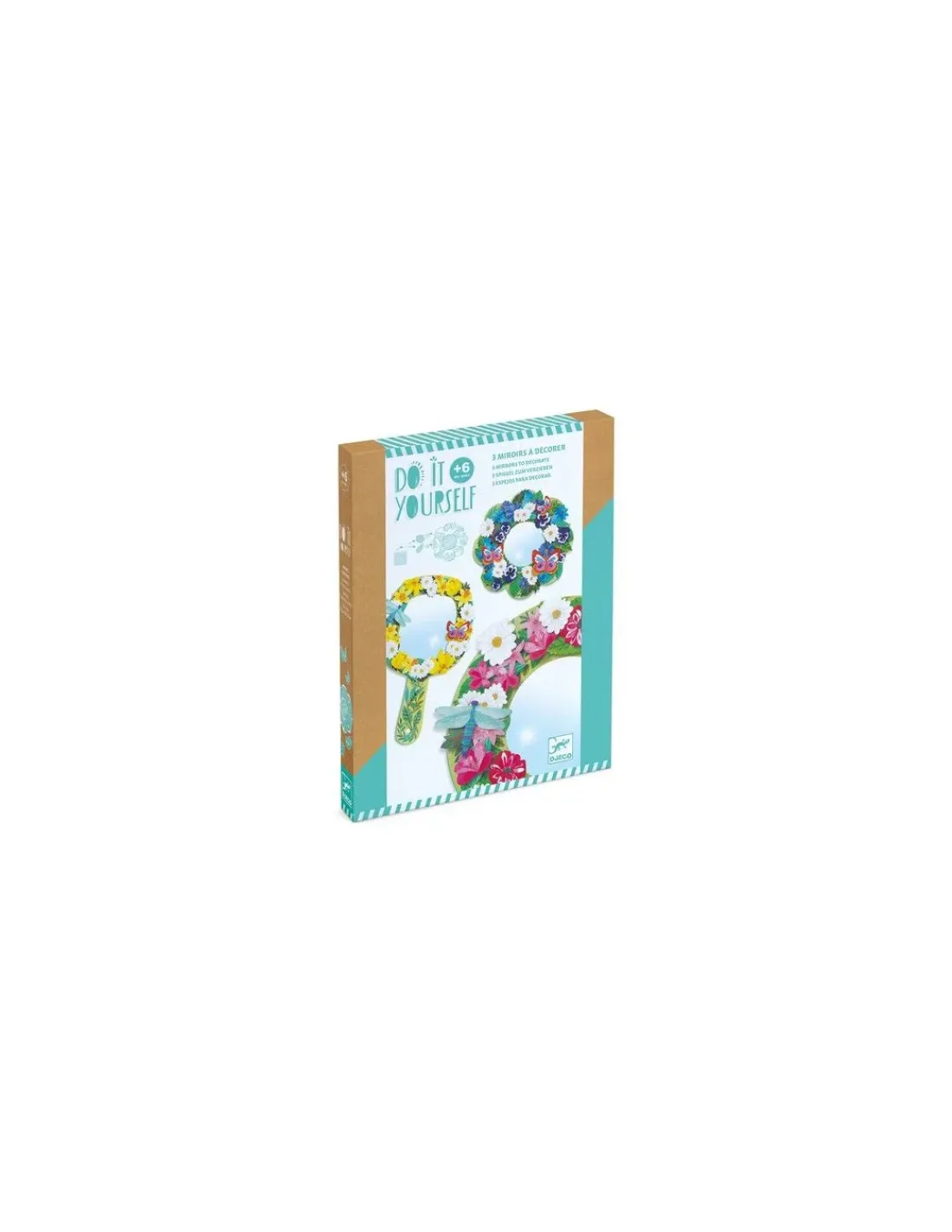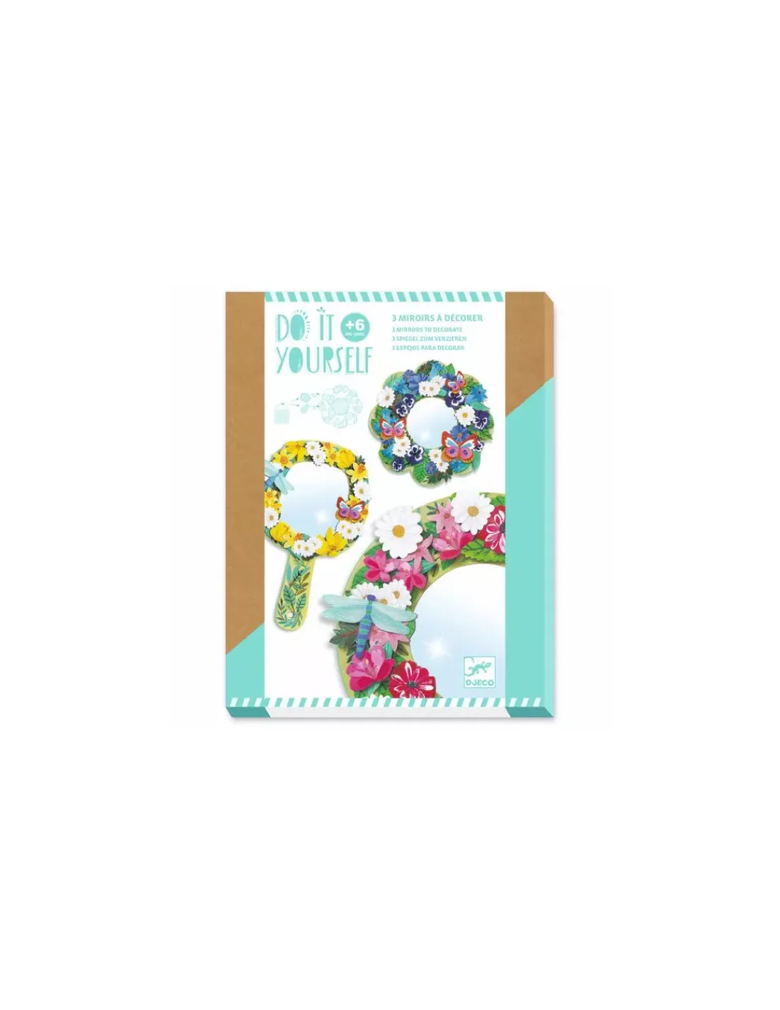 Découvrez les 3 miroirs à décorer de la collection Do It Yourself de Djeco, un coffret créatif pour les filles à partir de 6 ans avec 3 miroirs à décorer en superposant les couches de feuilles et de fleurs à l’aide des autocollants en mousse afin de donner du volume aux créations pour les faire ressembler à des couronnes de fleurs.