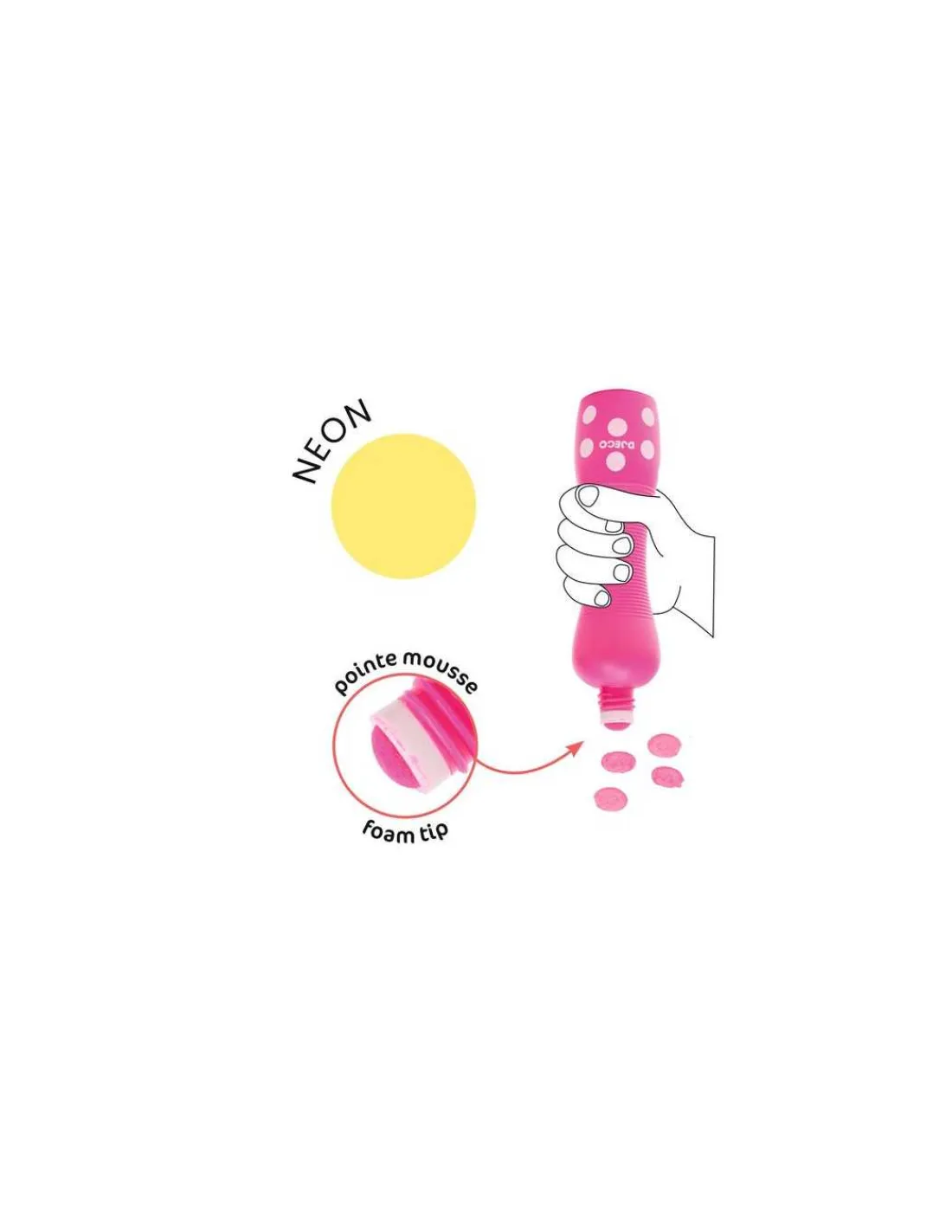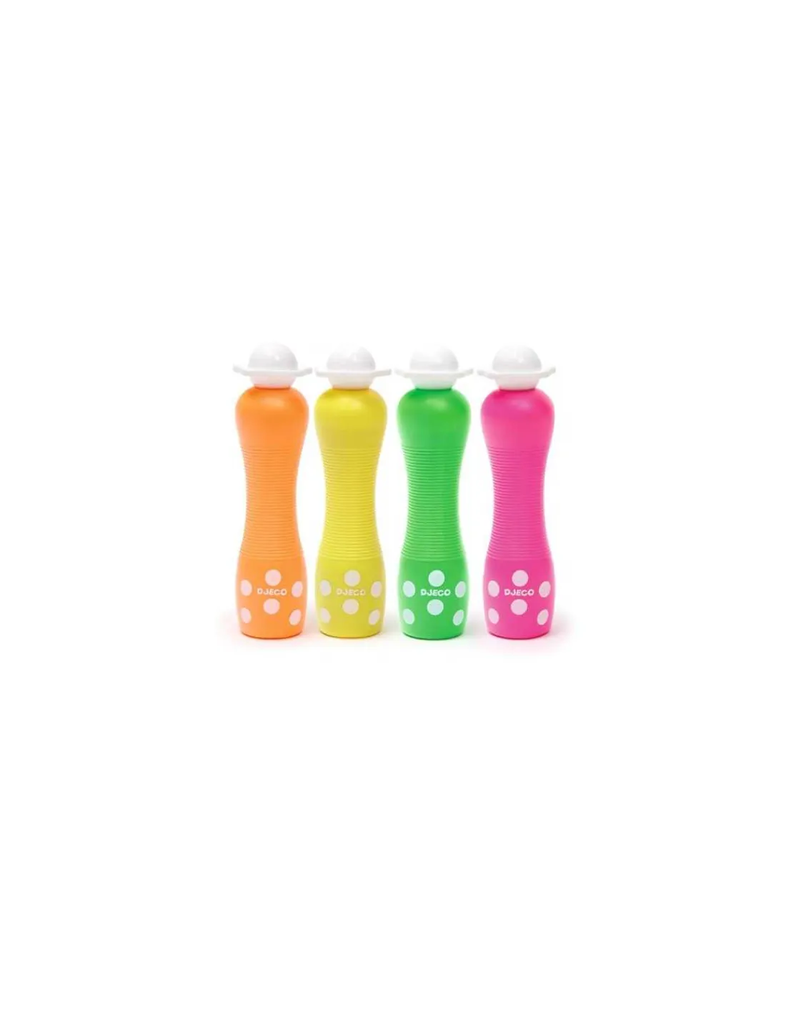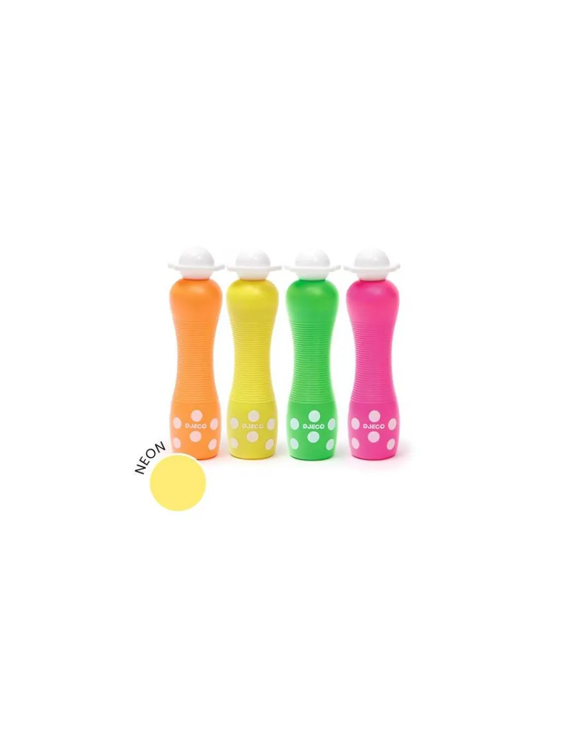 Découvrez les 4 marqueurs gros pois Néon de Djeco, un coffret composé de 4 gros marqueurs mousse permettant aux enfants de 3 à 6 ans de faire des points à effet fluo.