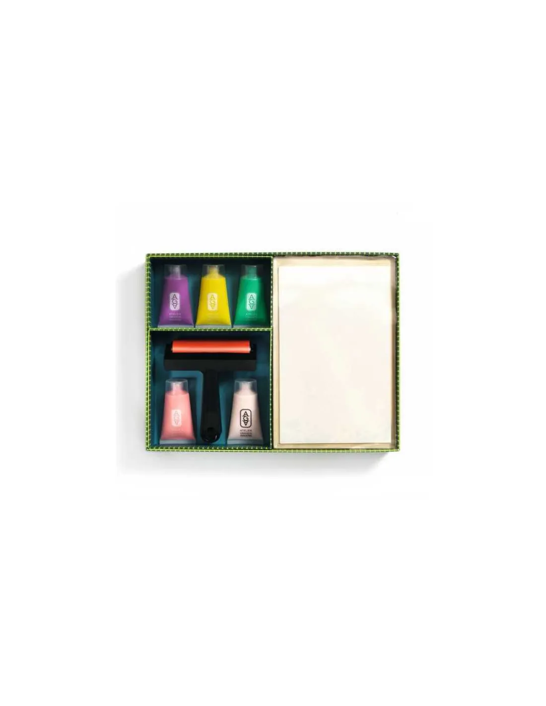 Ce coffret comprend 1 plaque de gel en silicone (format 235 x 150 mm), un rouleau brayer, 5 tubes de peinture 30 ml, 10 papiers à imprimer, 4 pochoirs indéchirables, 2 cadres en bois, un dépliant et une carte avec QR code menant à une vidéo tuto pour découvrir l’activité.
